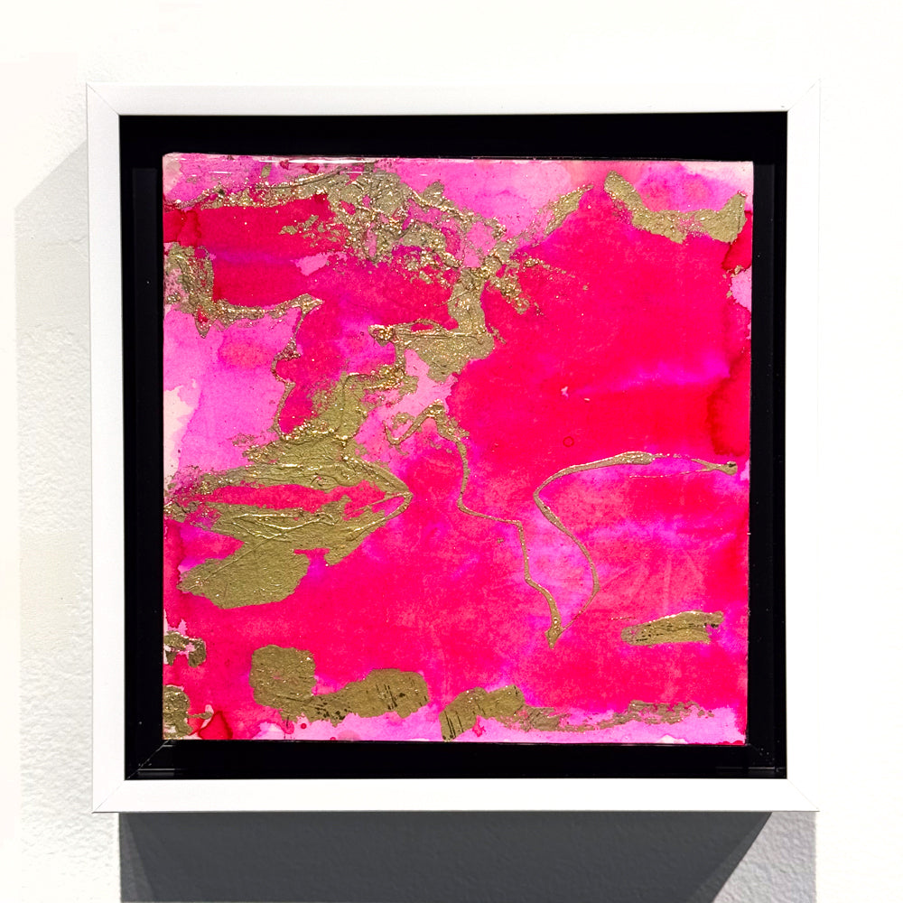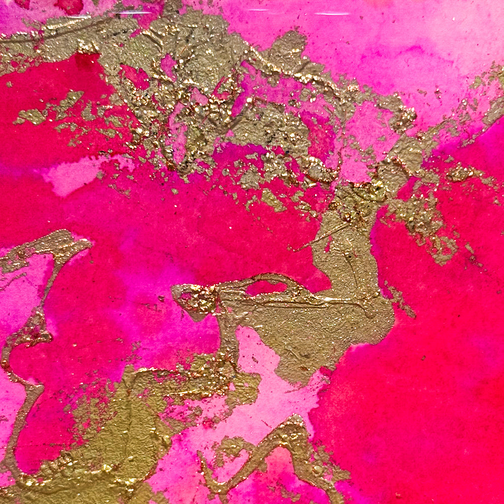 Marble by Ashley Mungons is a vibrant mixed media and resin piece filled with energy and elegance. Bold pink tones swirl across the surface, highlighted by shiny gold leaf accents that catch the light. This eye-catching artwork brings a fun and luxurious feel to any space.