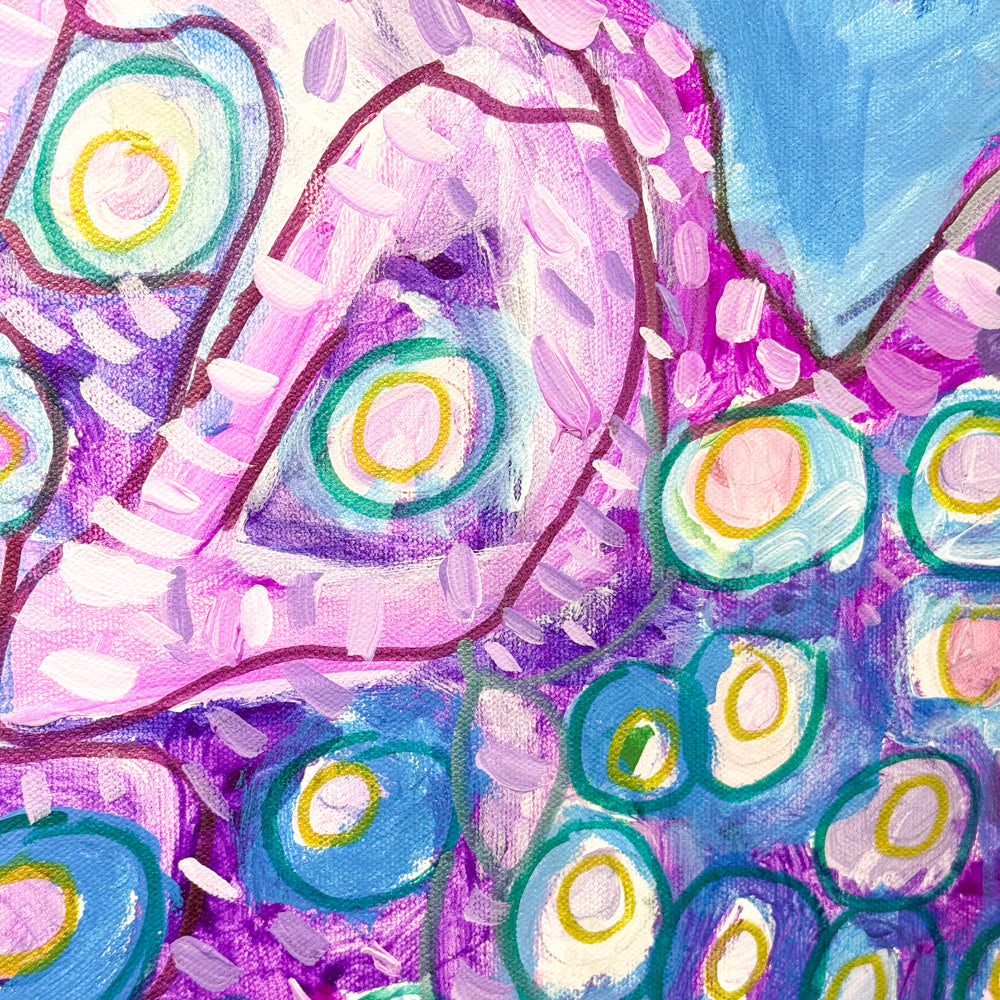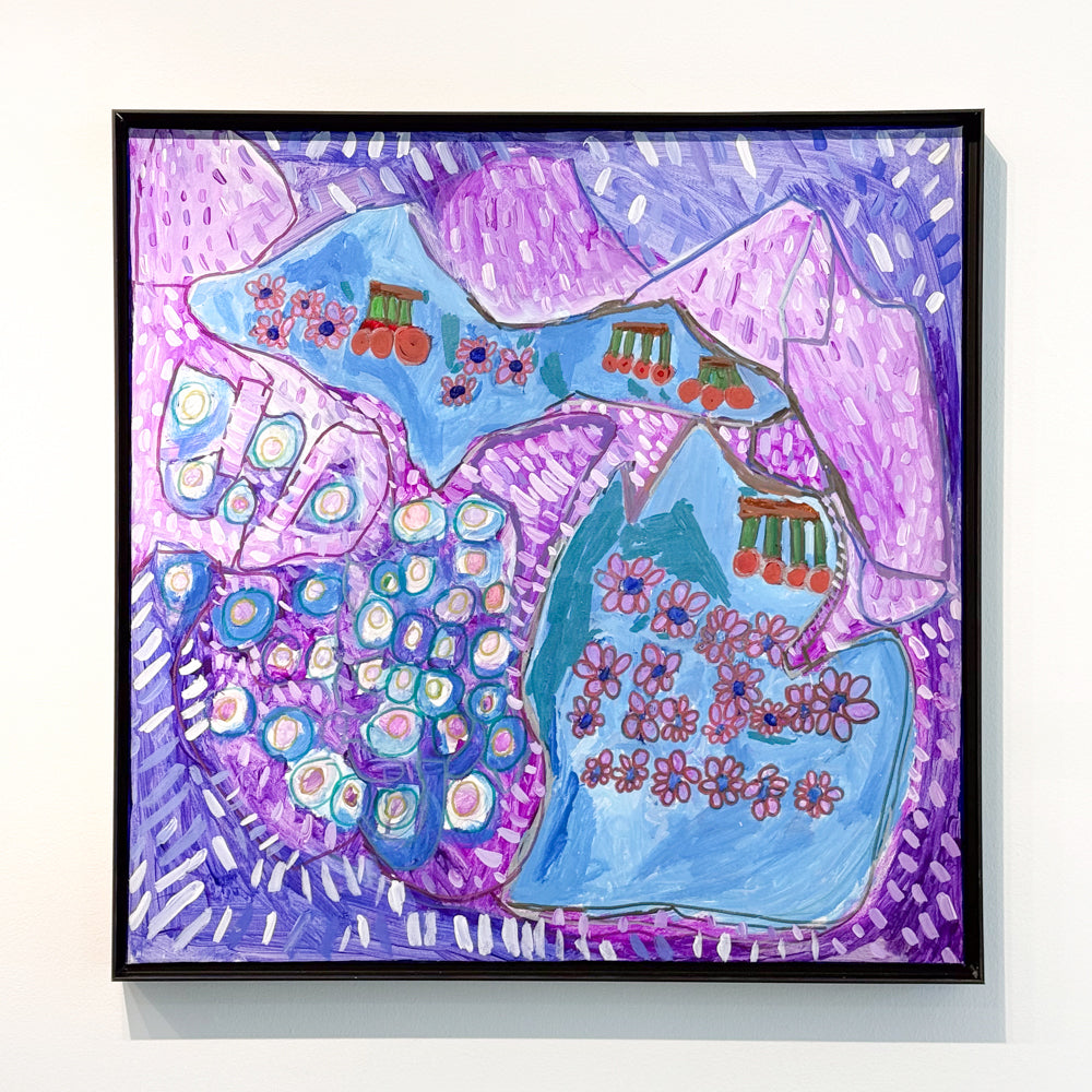 Michigan Cherries by Megan Donley is a joyful and imaginative celebration of Michigan’s beloved fruit. Painted in vibrant shades of purple, blue, and pink, the piece features abstracted maps of Michigan filled with bright red cherries, cheerful flowers, and playful patterns. With whimsical bursts of color throughout, the artwork captures the sweetness and pride of Michigan’s cherry season in a fun, dreamlike way.