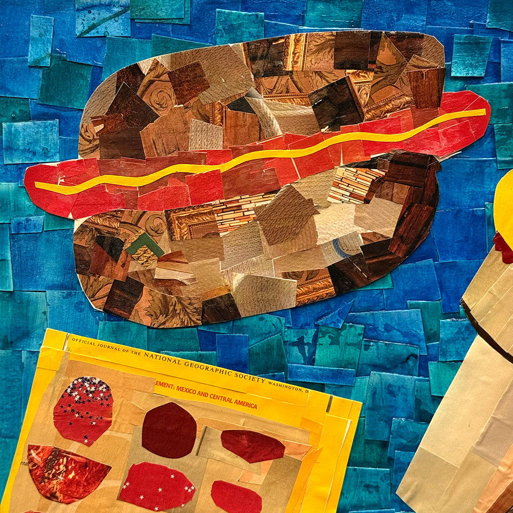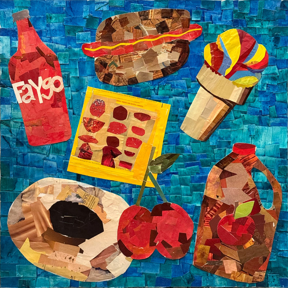 This colorful collage by Soul Studio celebrates iconic Michigan foods using hand-torn paper pieces full of texture and color. Set against a rich blue background, it features fun and recognizable favorites like a bottle of Faygo, a hot dog and Michigan cherries. Bright, playful, and full of hometown pride, this piece is a joyful tribute to Michigan’s unique food culture.