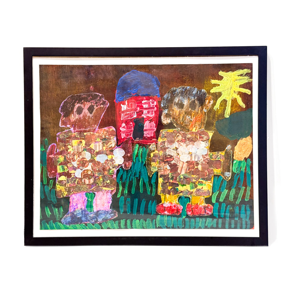 Michigan Friends by Jonathan Barnett is a colorful and joyful painting of two people standing together in front of a bright red house. Their shirts are made with lots of small shapes and colors, and the background is full of green grass, a yellow sun, and fun patterns. The artwork shows a happy moment shared between friends in Michigan.