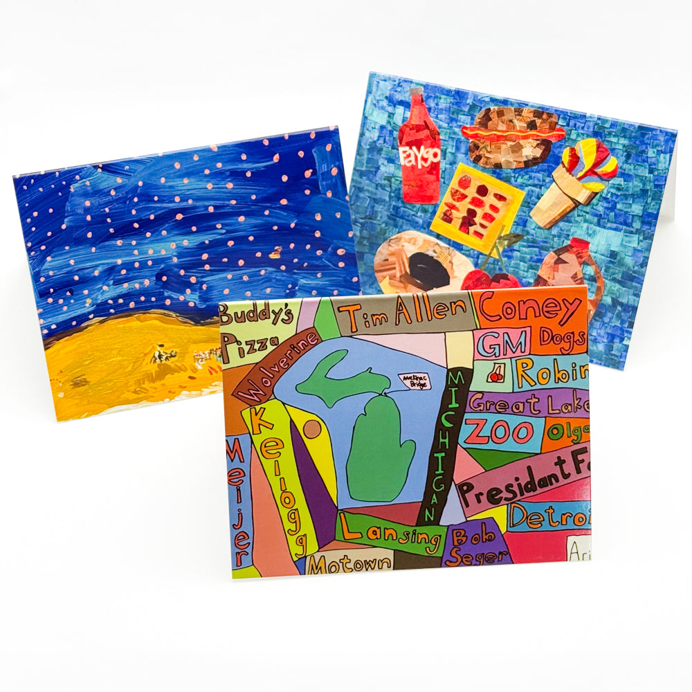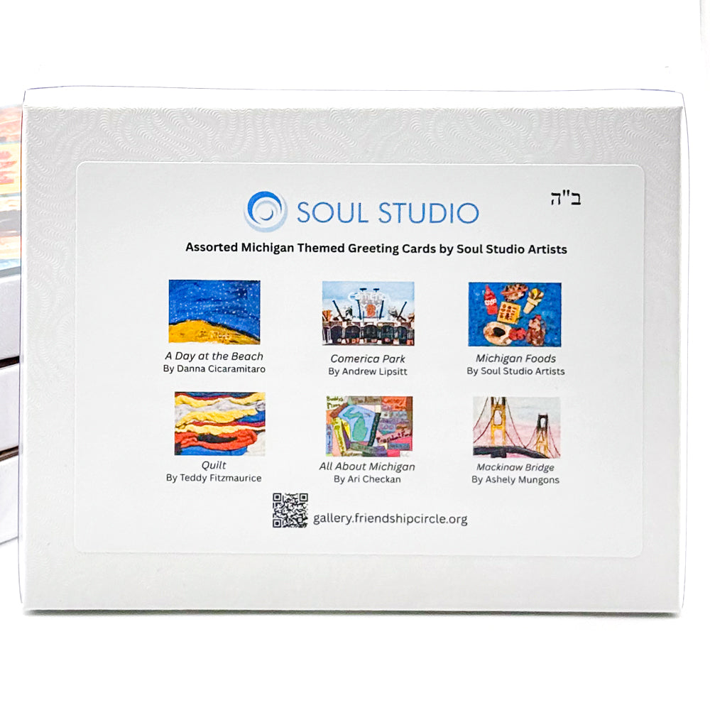 Set of 6 4.25 x 5.5 greeting cards featuring artwork by different Soul Studio artists.