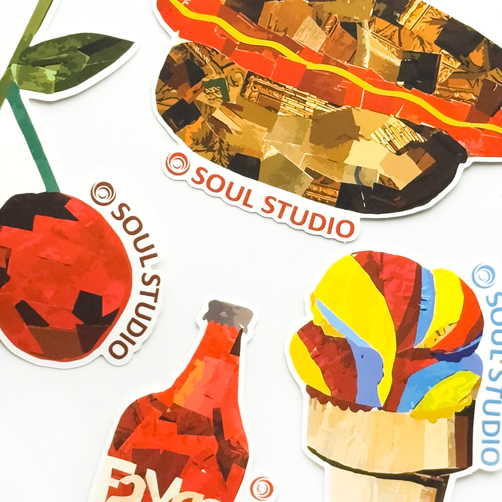 Michigan Sticker Pack by Soul Studio includes a fun collection of stickers that celebrate favorite Michigan treats. Each sticker is inspired by the Michigan Foods Collage which is made from colorful collaged paper and shows something iconic, like a red apple cider jug, a bright scoop of Superman ice cream, a pair of tart cherries, a Coney dog, and a classic bottle of Faygo. These cheerful designs are perfect for decorating notebooks, water bottles, or anything that could use a little Michigan flavor.