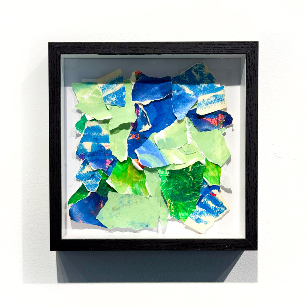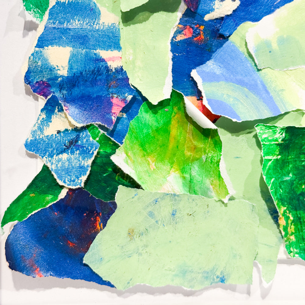 Milky Way by Julian Bahoora is a collage made from torn, painted papers in soft greens, blues, and bold hints of pink and orange. The overlapping layers create a swirling, cloud-like effect that feels like a view into deep space. Each piece adds to the sense of movement, like stars drifting in a colorful galaxy.