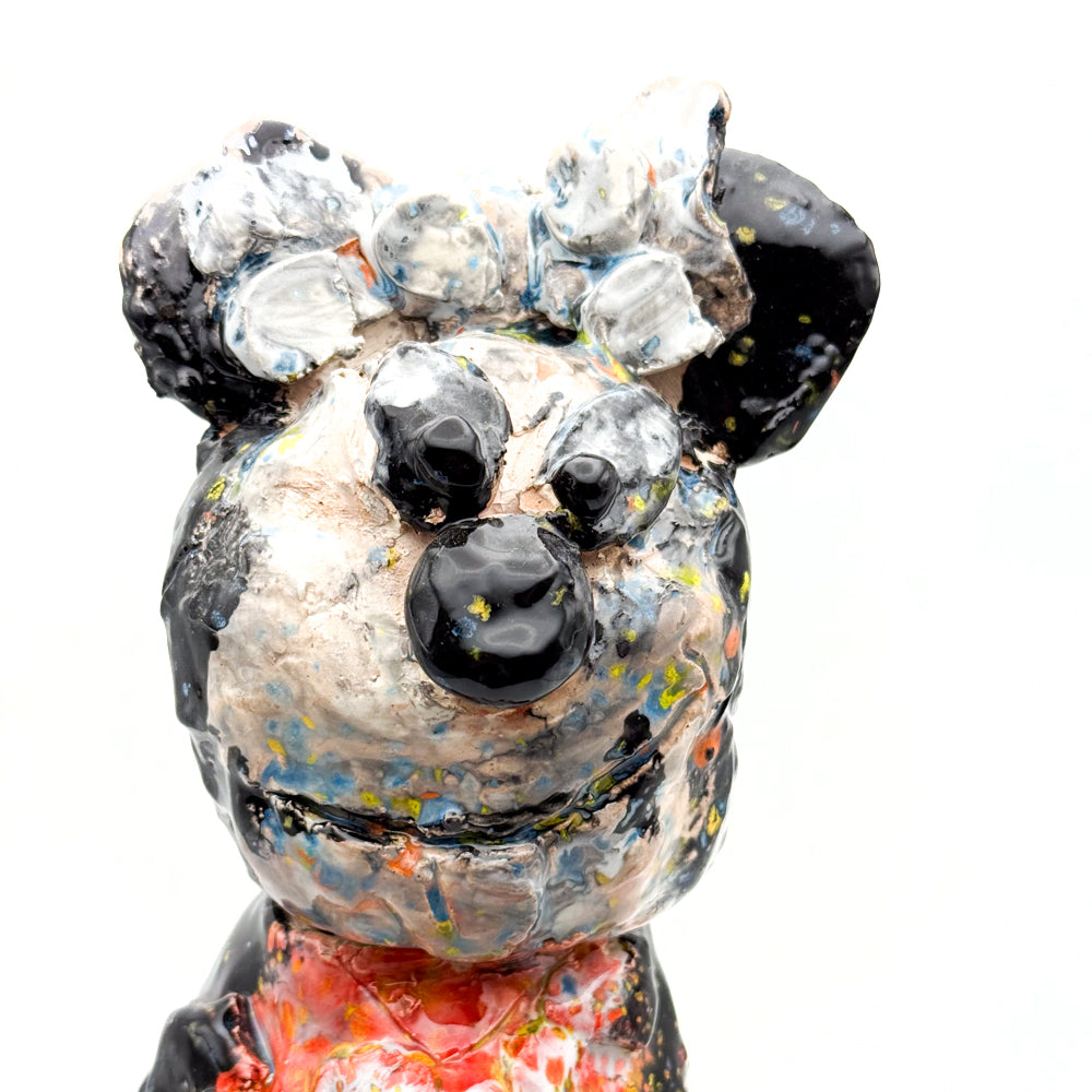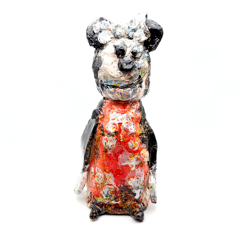 Minnie Mouse by Stephanie Harris is a bright and playful ceramic sculpture of the beloved cartoon character. Minnie stands tall in her red dress with white polka dots and a large bow on her head. Her face is full of personality, with bold black ears and a cheerful expression.