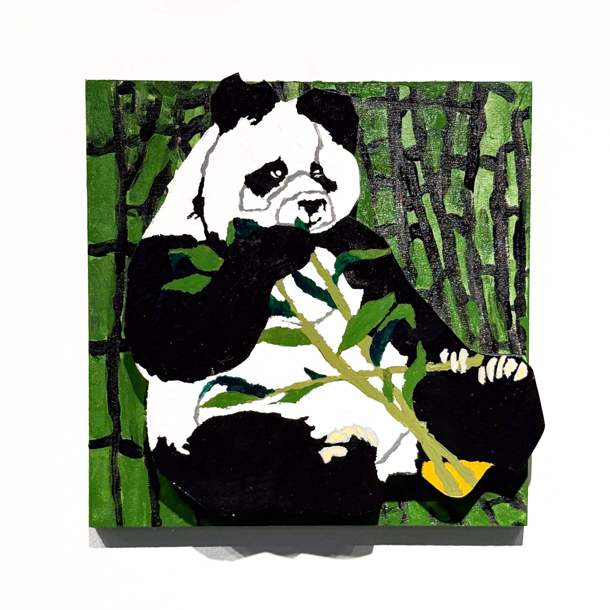 Miranda the Panda by Mikayla Woodiwiss is a mixed media artwork on wood showing a panda sitting in a bamboo forest. The black and white panda holds a green bamboo branch while surrounded by tall green stalks and leaves. Bold shapes and simple colors make the panda stand out against the leafy background.