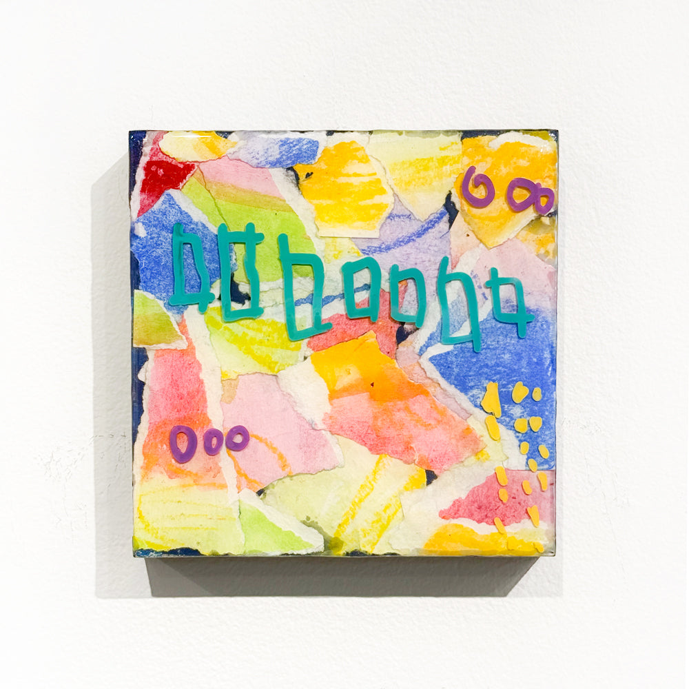 Motown by Teddy Fitzmaurice is a bright and playful artwork full of color and rhythm. The background is made from torn watercolor paper in fun shades of pink, yellow, blue, and orange covered in resin. On top, bold shapes dance across the piece, like music notes or sounds. This piece feels like a celebration of Detroit’s famous music, full of energy, movement, and joy.