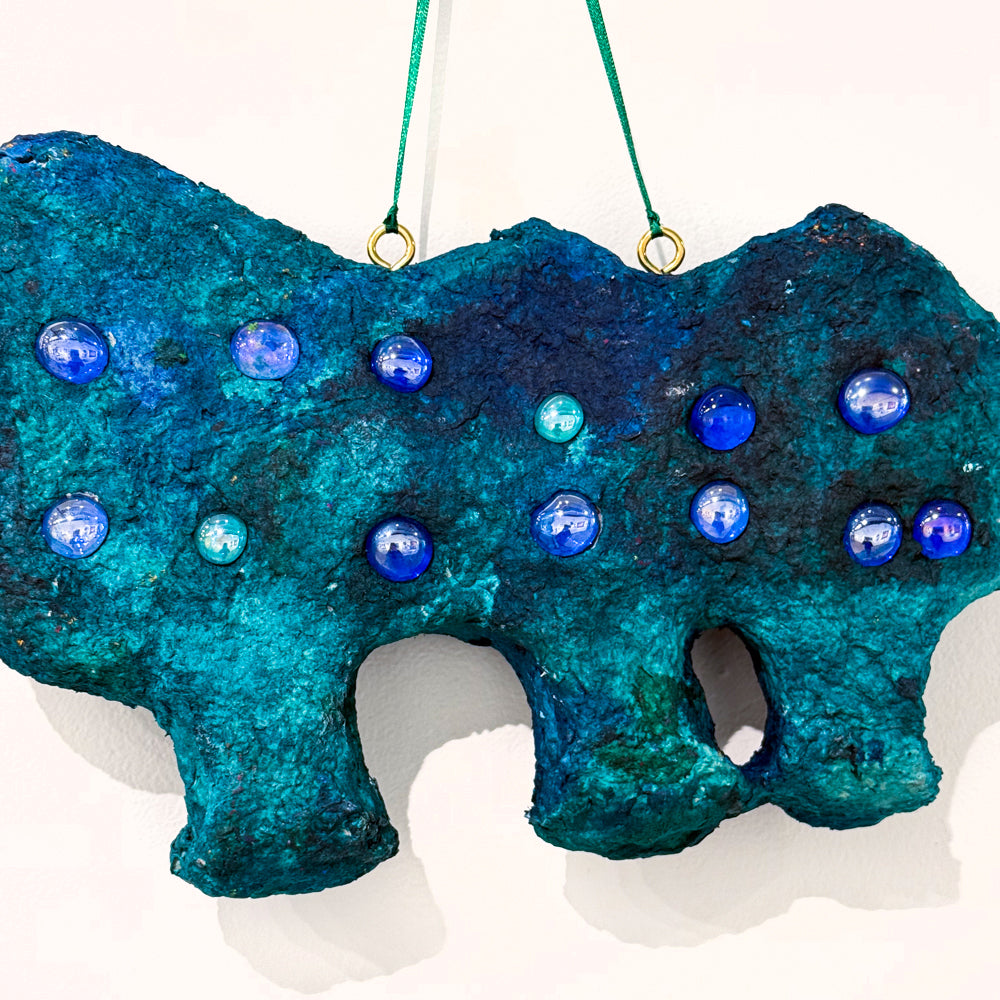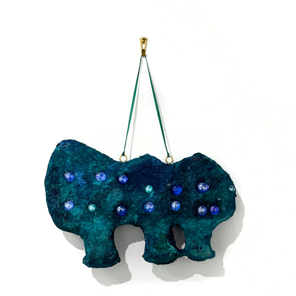 Mushrooms by Louis Smart is a textured mixed media sculpture in deep shades of green and blue. Shiny glass marbles are set across the surface, glowing like drops of water or tiny lights. The organic shape and rich colors make the piece feel earthy and mysterious, like something found in a magical forest.