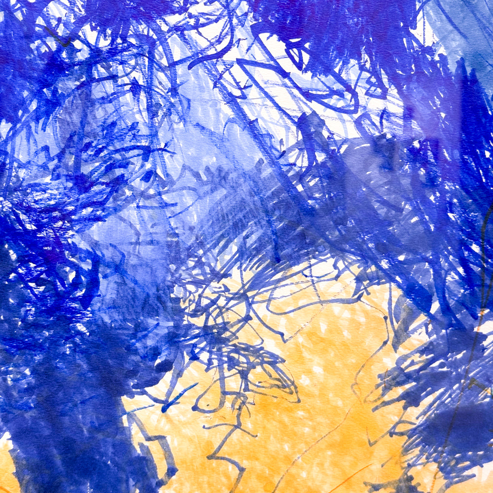 No Name by Cquat Taylor is a bold and expressive drawing made with swirling blue and orange marks. Lines move in different directions, creating a feeling of energy and motion. The colors blend and clash like a windy sky and glowing ground.