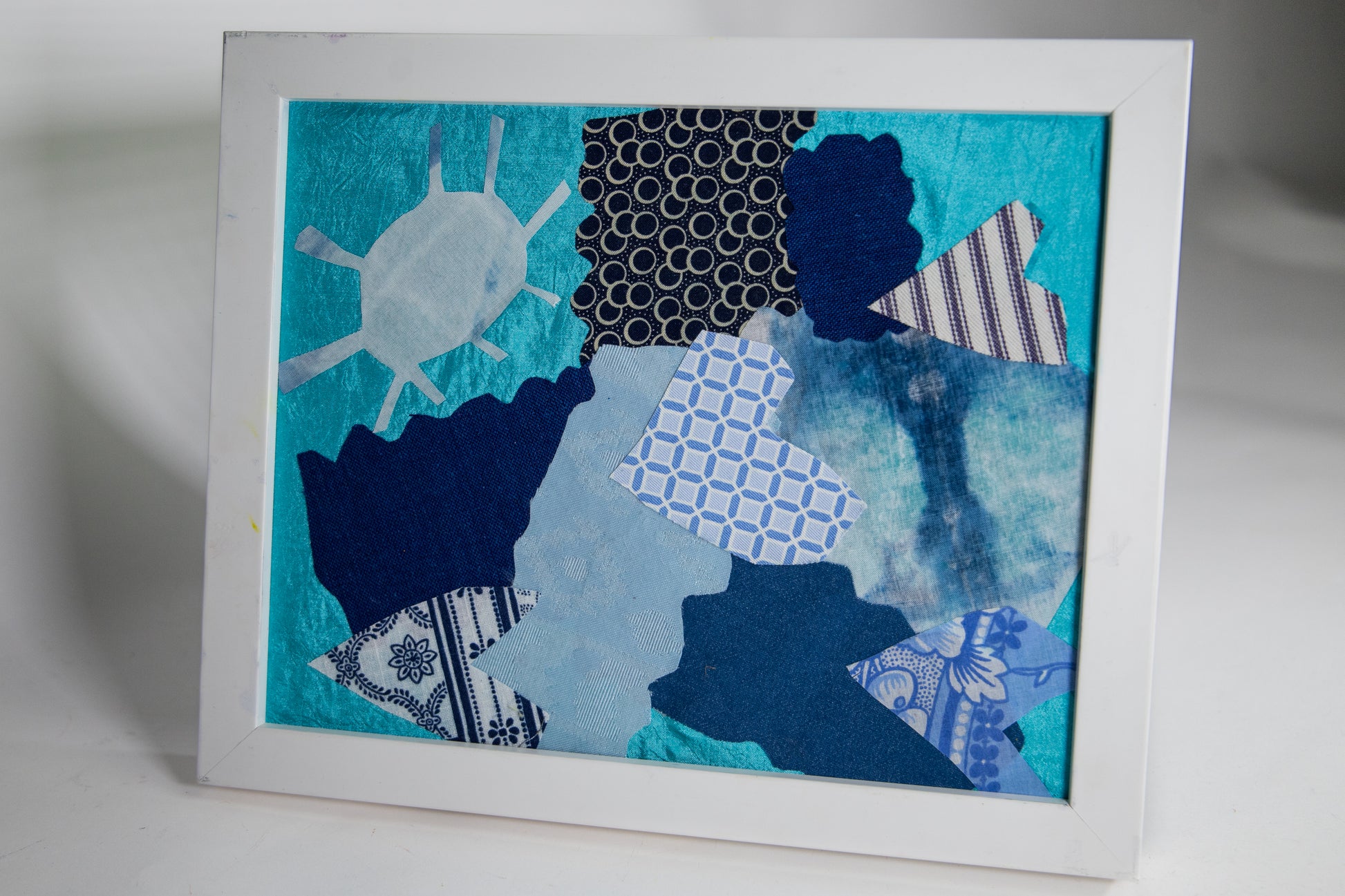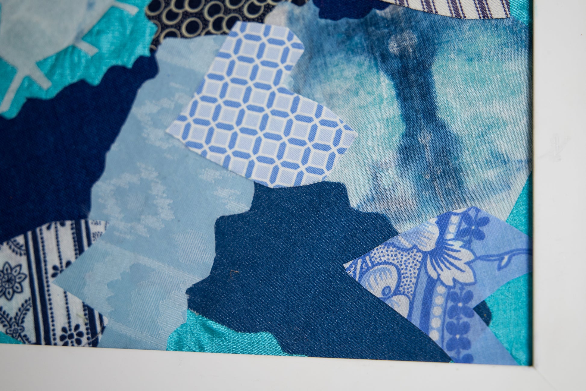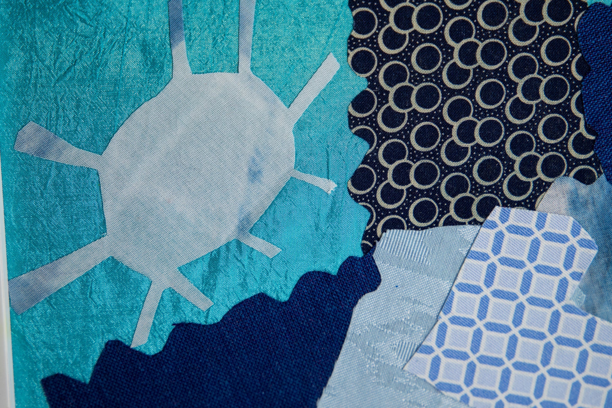 "Ocean Textures" is a handmade fabric collage by Lindsey Raphael. In her work, she uses different monochromatic patterns of blue to represent an oceanic scene. Allow yourself to be inspired by the beauty of the ocean!