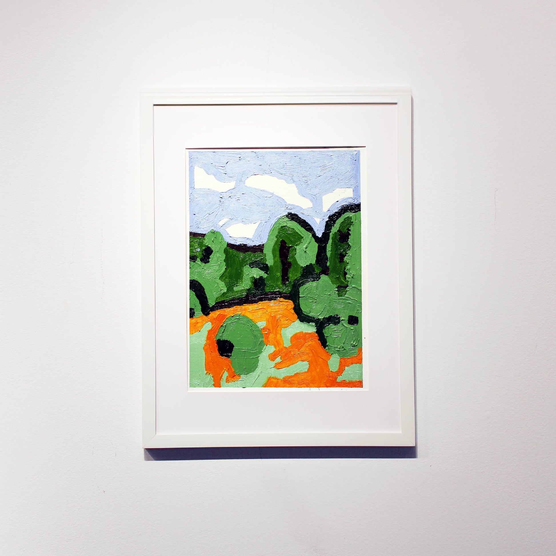 "Orange, Blue, Green" by Kyle Aldrich captures the vivid beauty of a memorable horseback riding trip in Colorado. The bold colors and dynamic strokes reflect the awe and excitement Kyle felt while experiencing the colorful mountains.