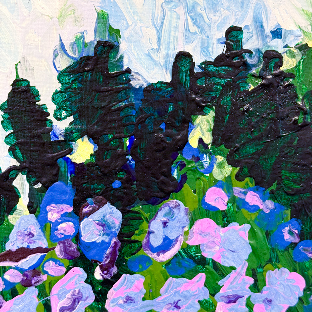 Outdoors by Shira Schweitzer shows a bright and colorful outdoor scene. Soft blue and white paint creates a calm sky above tall, dark green trees. In the front, pink and purple flowers fill the ground, painted with thick brushstrokes that make them feel full and lively. The whole piece has a fresh, peaceful feeling, like spending a warm day outside surrounded by nature.
