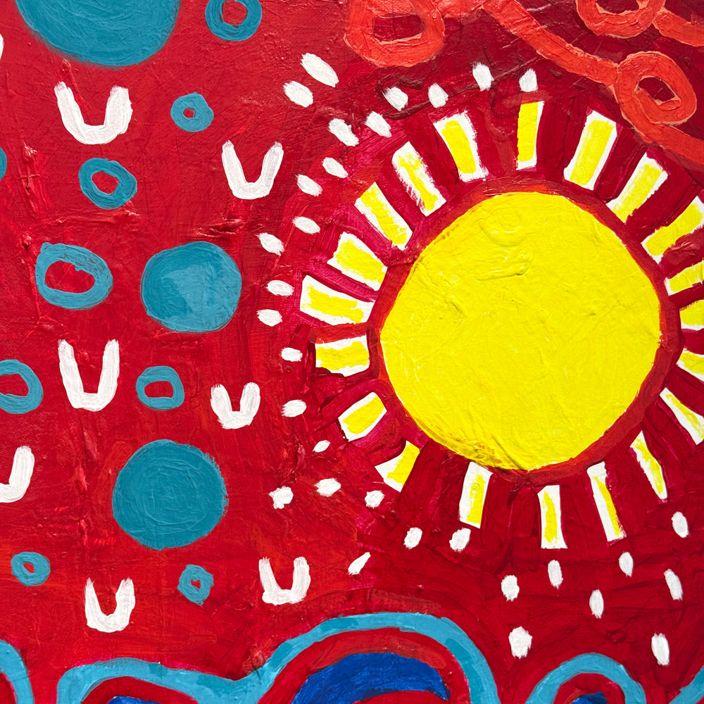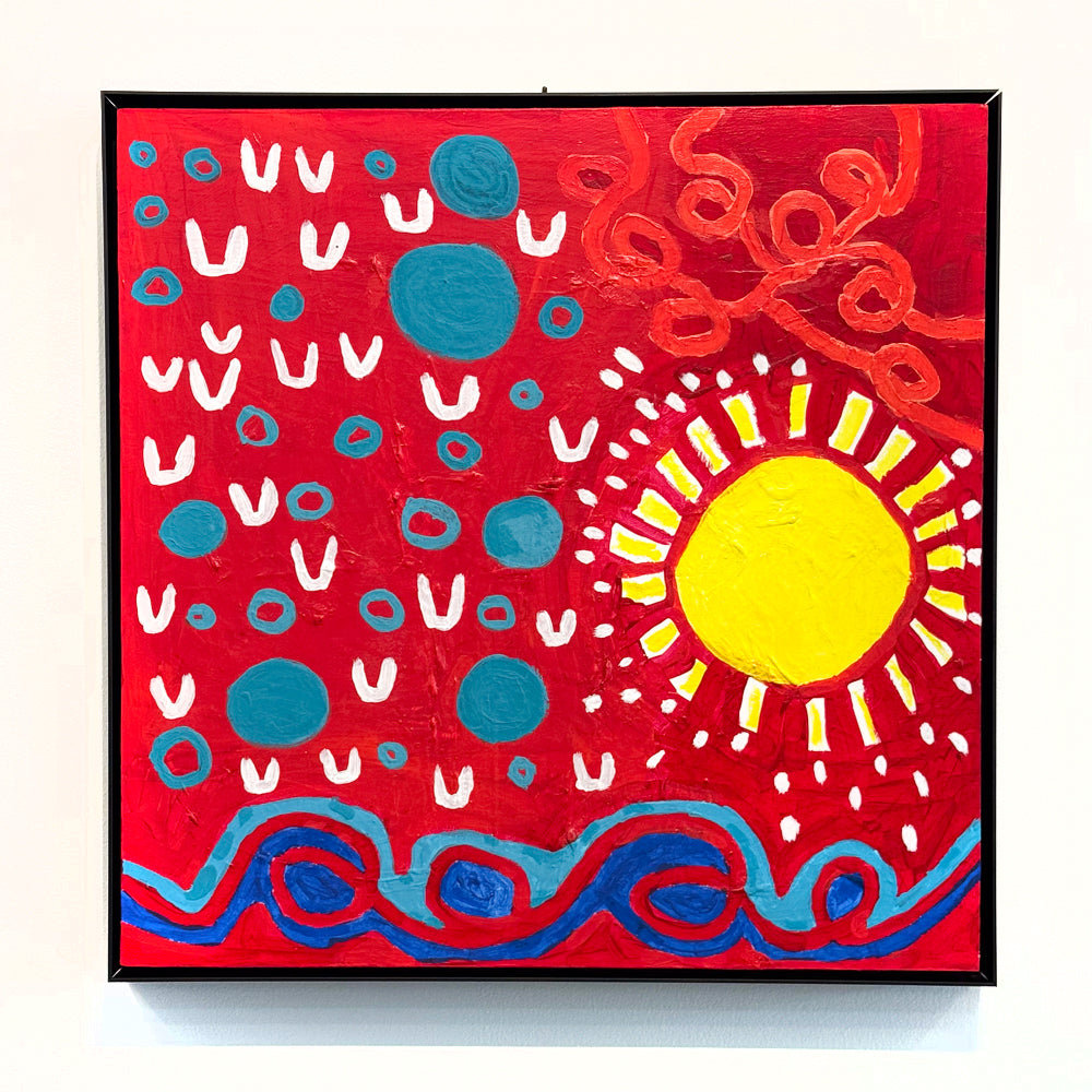 Patterned Ocean by Brandon Fee is a bold and colorful painting filled with shapes, movement, and energy. A bright yellow sun shines on the right, surrounded by dots and lines that look like rays. On the left, teal blue circles and white shapes float like bubbles in the red background. Wavy blue and red lines flow across the bottom, suggesting waves in the ocean. The piece feels warm, playful, and full of life.