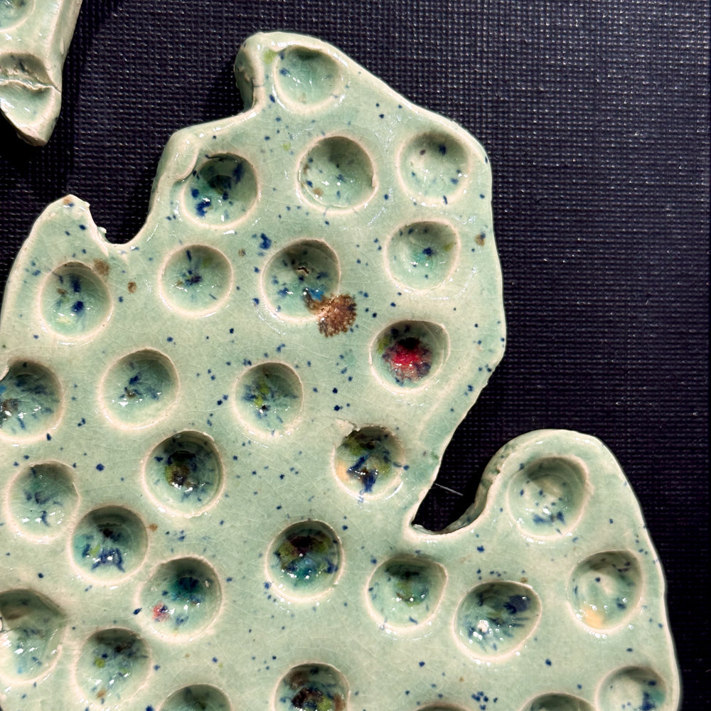 Polka Dot Michigan by Matthew Schwab is a playful ceramic piece shaped like the state of Michigan. Covered in light green glaze, the surface is full of round, dimpled dots—each one with tiny bursts of color inside. The raised textures and speckled colors make the whole piece feel fun and full of energy.