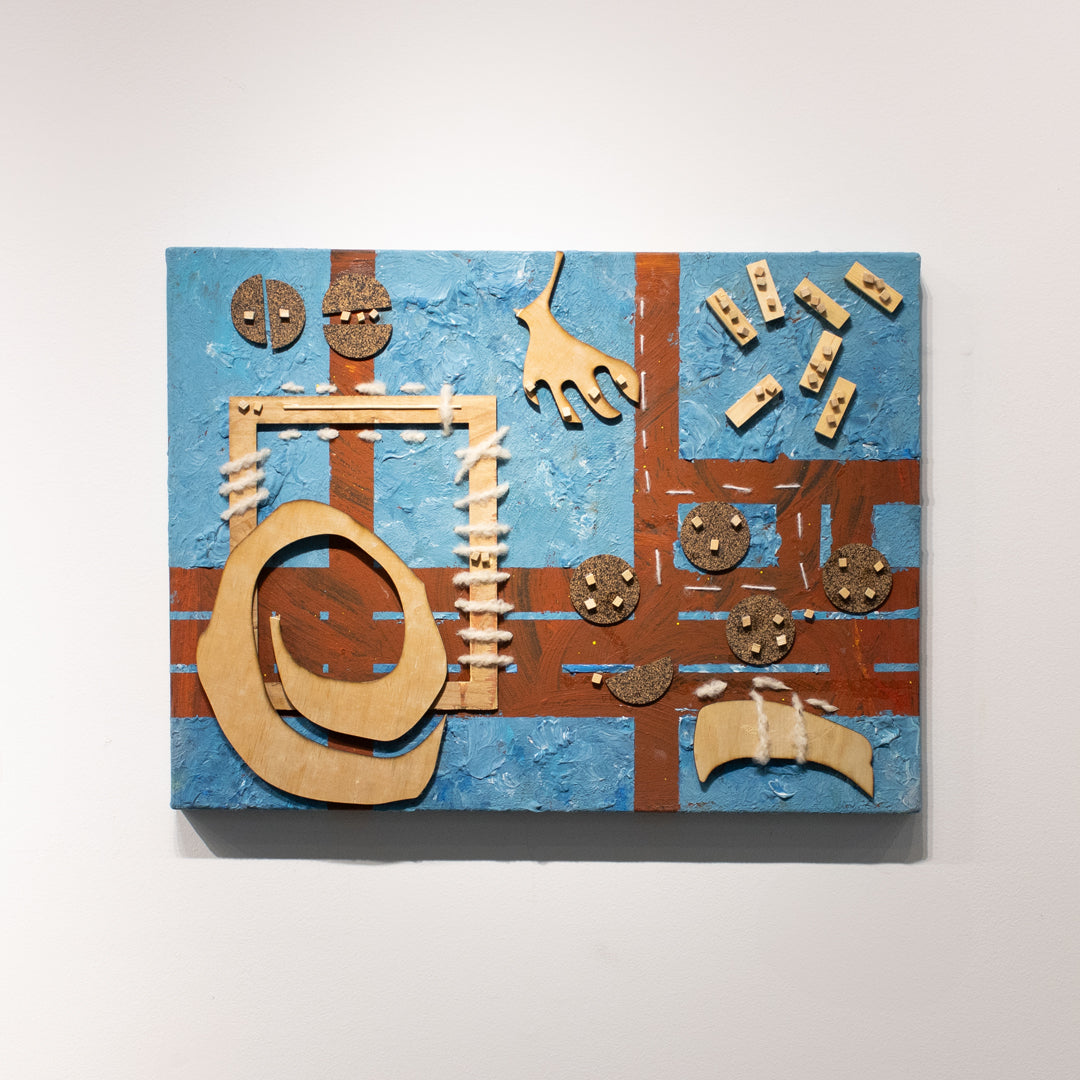 "Complicated" by Danny Jonas is a thought-provoking mixed media painting that intricately blends textures and shapes to create a captivating visual narrative. The artwork features a textured blue background intersected with rust-colored lines, forming a grid-like structure. Embedded within this structure are various wooden and cork elements, including abstract shapes, discs, and rectangular blocks, some of which are connected with white stitching. The juxtaposition of these elements creates a sense of complexity and depth, inviting viewers to explore the interconnectedness and layered meanings within the piece.