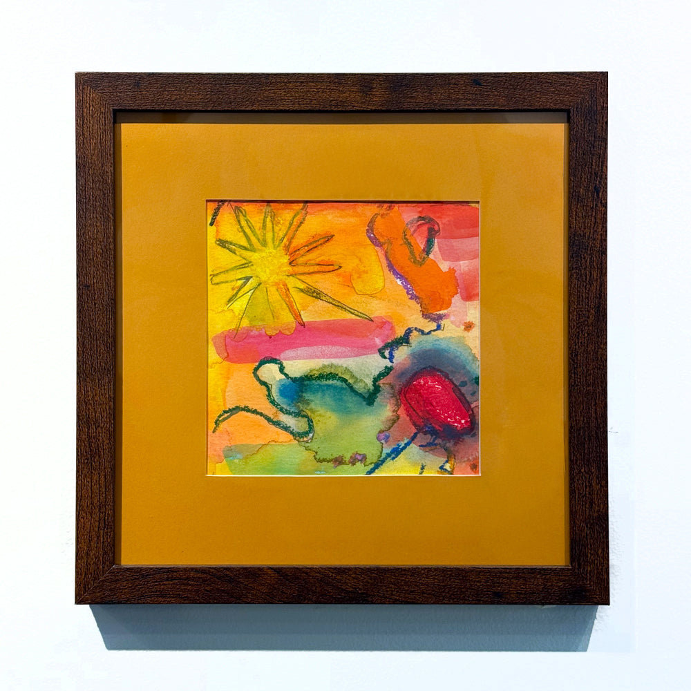 Purple Dots and Yellow Sunshine by Lindsey Feldman is a bright and cheerful artwork filled with warm colors. A bold yellow sun shines in the top corner, while soft purple dots and flowing shapes spread across the page. The mix of watercolor and pastel creates a playful, glowing scene that feels happy and full of light.