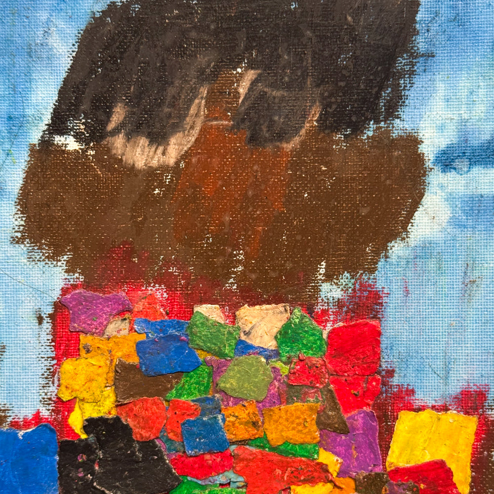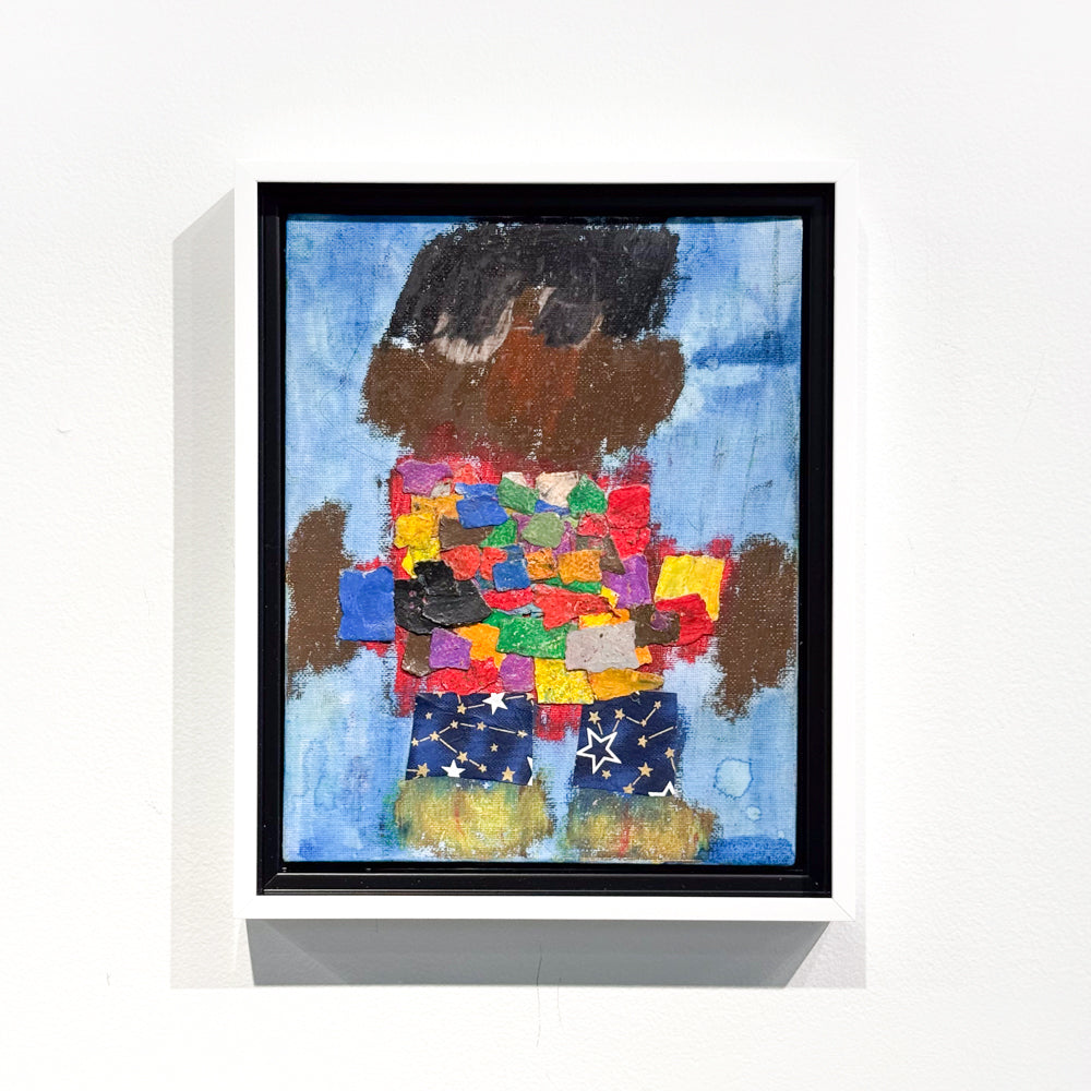 Red Shirt by Jonathan Barnett is a bright and playful artwork showing a person with a colorful shirt made from torn pieces of paper. The red shirt is filled with bits of yellow, green, blue, and more, giving it a fun, patchwork look. The starry blue shorts and soft blue background add to the cheerful feeling. This piece is full of personality and creativity, like someone ready for a fun day.