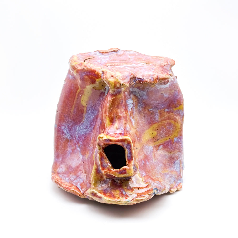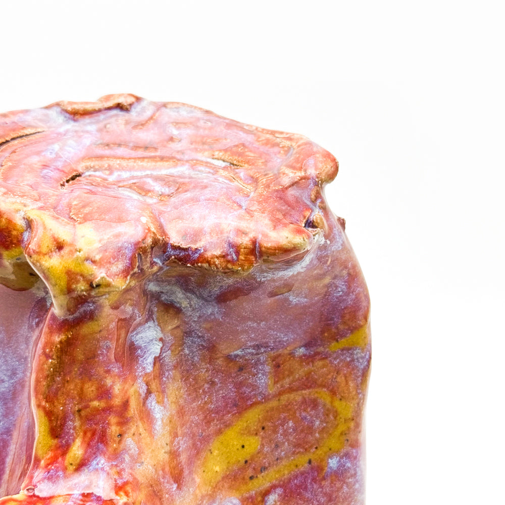 Red White by Blake Jackson is a ceramic piece with a rough, organic shape and a shiny surface. The glaze blends red, yellow, and white tones, creating a soft swirl of colors. With its uneven form and open hole at the front, the piece feels alive and full of character, almost like it has its own expression.