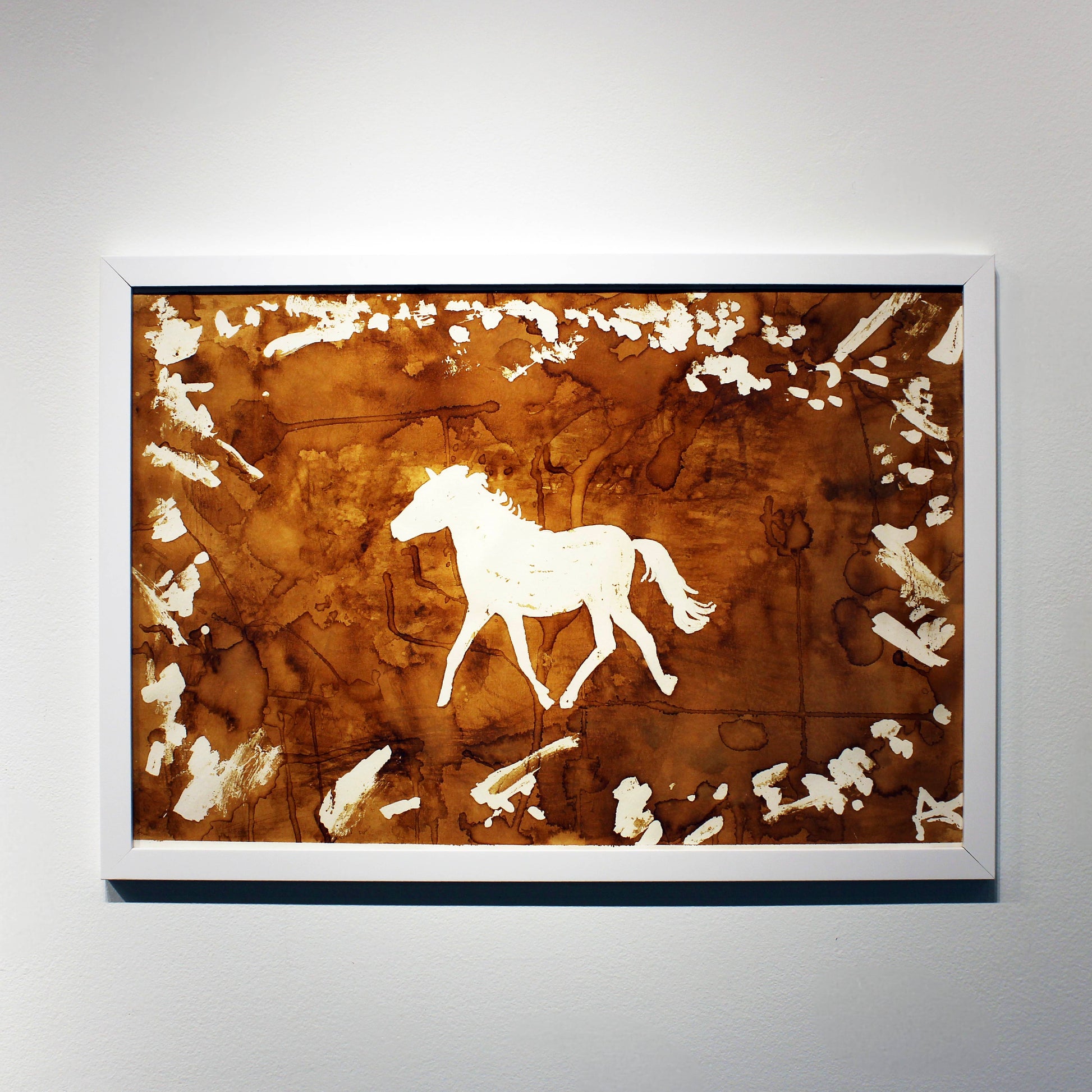 "Romy," by Alyssa Gold, is a painting of a horse made with coffee. Alyssa chose coffee as her medium because it's her favorite scent. The warm, brown tones of the coffee give the painting a cozy feel and highlight the horse's beauty and strength. Alyssa's work goes beyond just being visual; it also engages the sense of smell, showing her unique and heartfelt way of experiencing and sharing art.