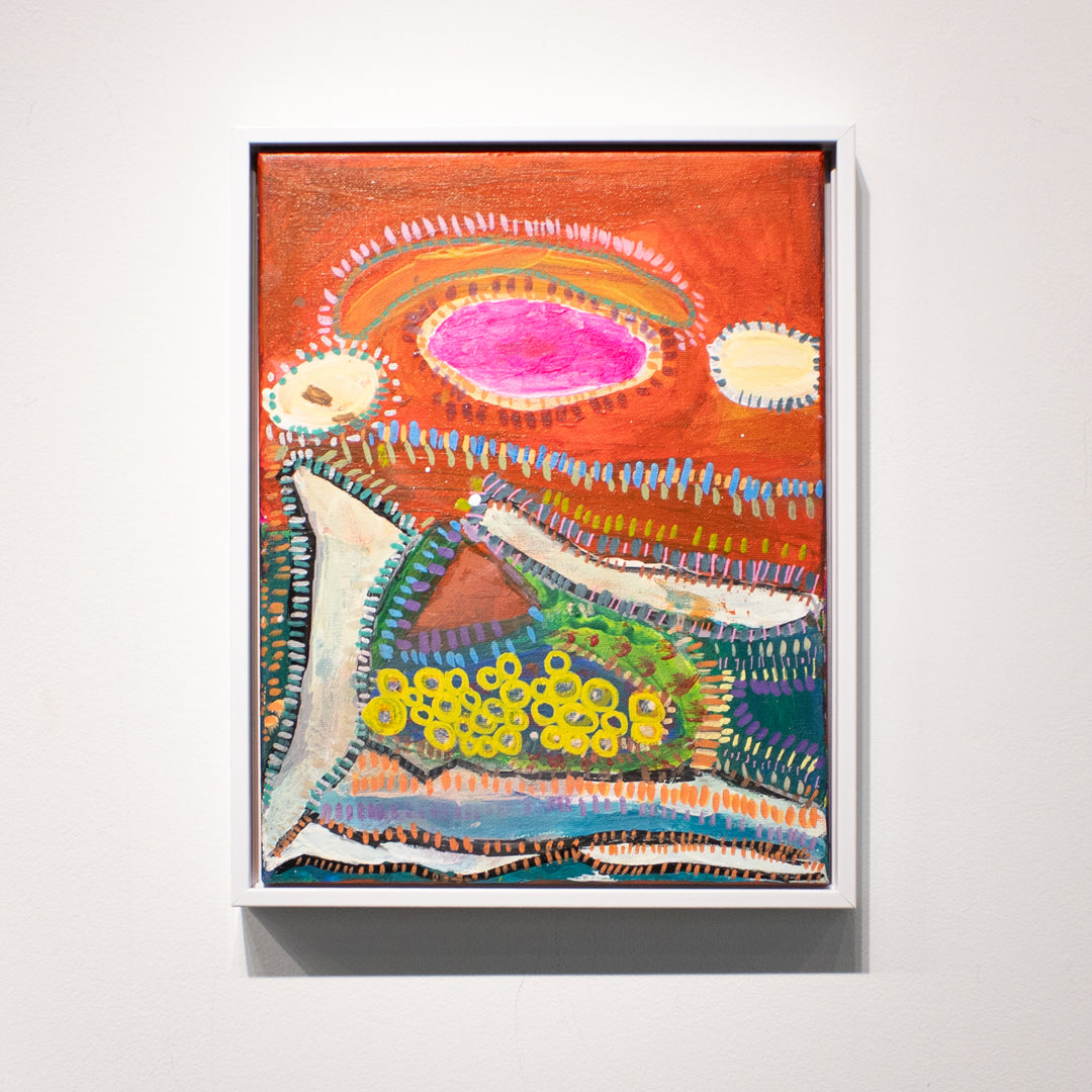 My painting features bright colors and shapes with added texture from paint markers. Inspired by a sailboat and sunset drawing, I transformed it into an abstract acrylic piece, painting intuitively and quickly to capture the joyful essence of a sunset, aiming to evoke the same happiness in viewers while learning new techniques.