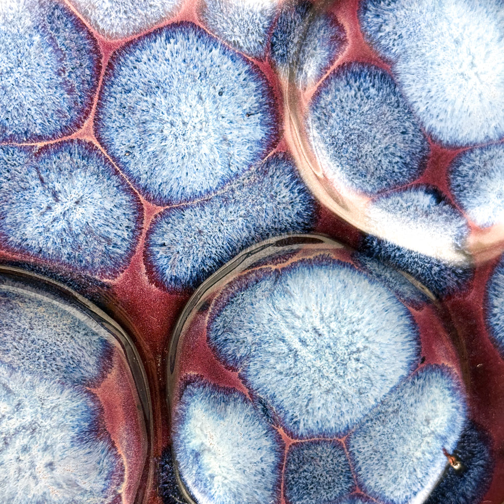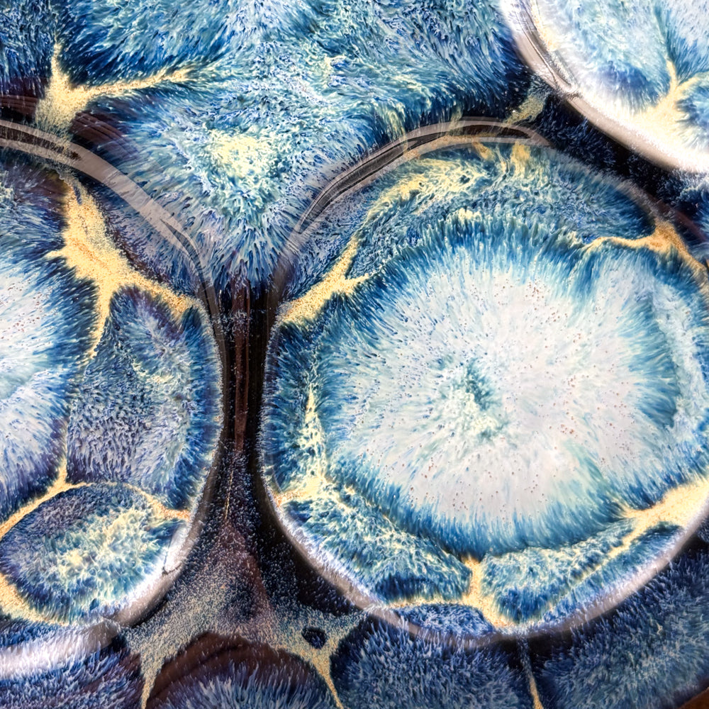 This exquisite handmade ceramic Seder plate showcases the mesmerizing **frozen pond glaze technique**, creating a dynamic interplay of icy blues, soft whites, and deep, crackled textures reminiscent of a shimmering winter lake. Thoughtfully crafted, each plate is unique, with six delicately formed indentations for the symbolic Passover foods, blending tradition with contemporary artistry. The smooth, high-fired ceramic provides durability, while the flowing glaze effect adds a striking visual depth, making it not just a ritual centerpiece but a stunning piece of functional art for your holiday table.
