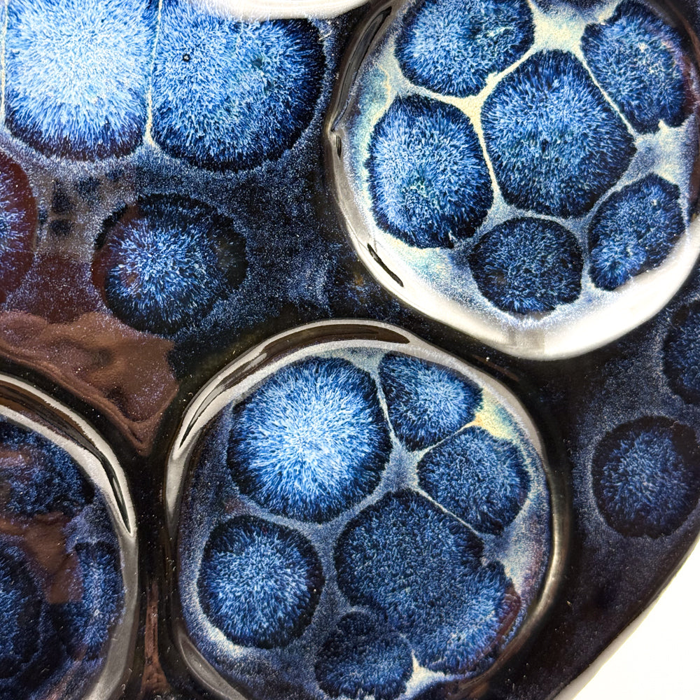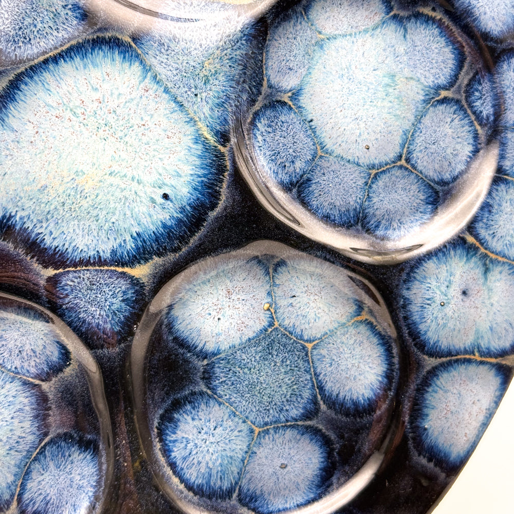 This exquisite handmade ceramic Seder plate showcases the mesmerizing **frozen pond glaze technique**, creating a dynamic interplay of icy blues, soft whites, and deep, crackled textures reminiscent of a shimmering winter lake. Thoughtfully crafted, each plate is unique, with six delicately formed indentations for the symbolic Passover foods, blending tradition with contemporary artistry. The smooth, high-fired ceramic provides durability, while the flowing glaze effect adds a striking visual depth, making it not just a ritual centerpiece but a stunning piece of functional art for your holiday table.