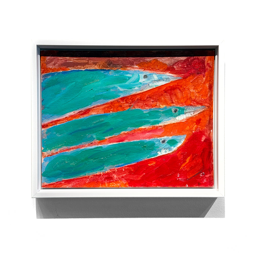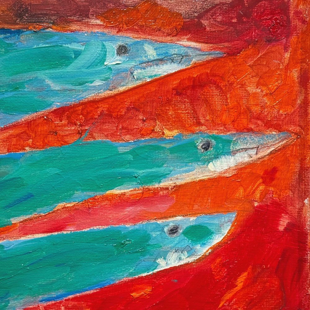 Sharks in Sync by Evelyn McCollough is a bold and colorful oil painting. Three blue-green sharks swim across a bright red and orange background. The brushstrokes are thick and textured, giving the piece movement and energy. This painting shows Evelyn’s fun and fearless approach to art.