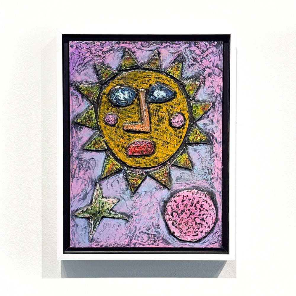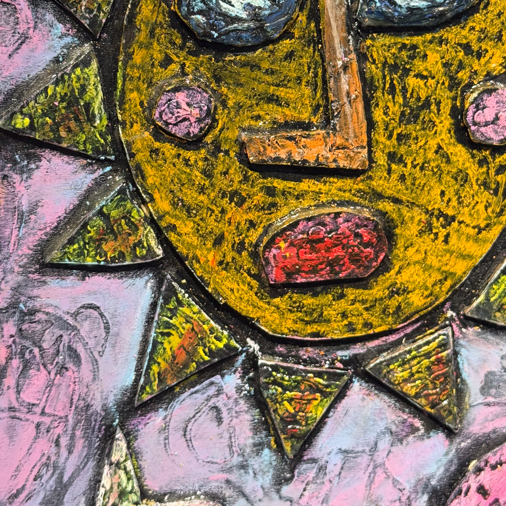 Smiley Face by Caryn Martel is a mixed media artwork full of color and texture. A bright yellow sun with a face takes center stage, surrounded by a pink sky and shapes. The thick lines and raised shapes give the piece a playful, sculpted feel—like a drawing that’s come to life.