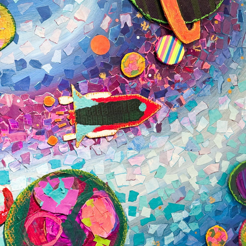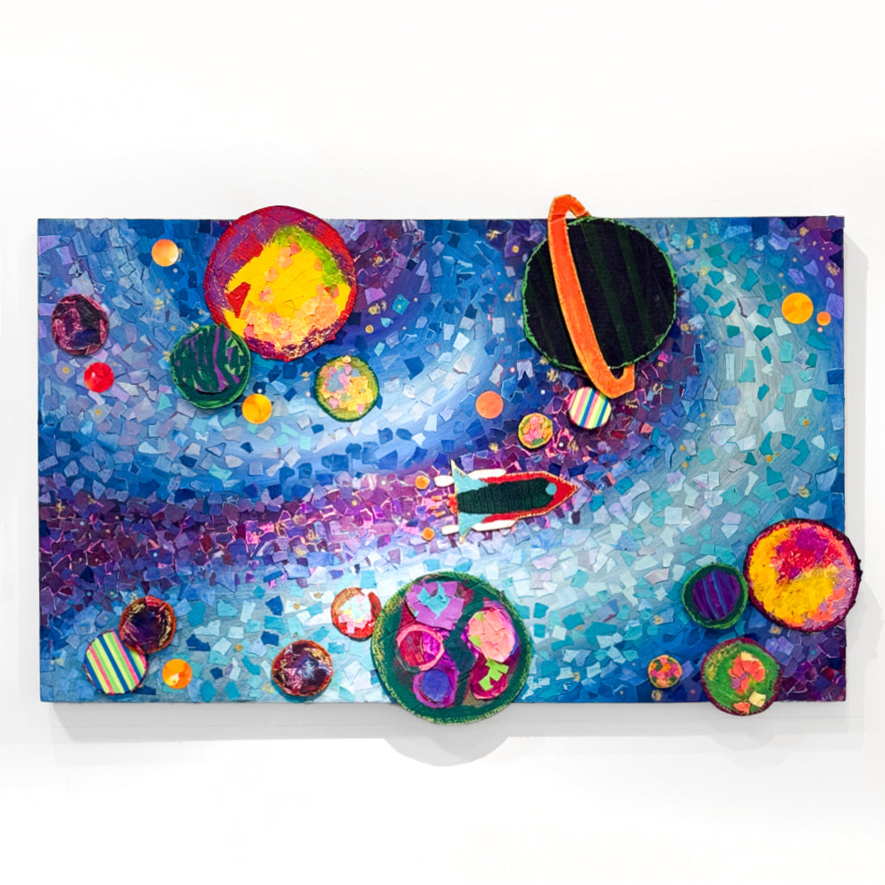 Soul Studio Space by Julian Bahoora, Stacey Salzberg, Stephanie Harris, Macko Matlen, Terry Majewski, and Megan Donley is a colorful mixed media artwork that takes you on a trip through outer space. Bright planets, stars, and a rocket ship float across a swirling galaxy of blues and purples. The mix of textures and vivid colors makes the piece feel full of life and imagination, like an adventure among the stars.