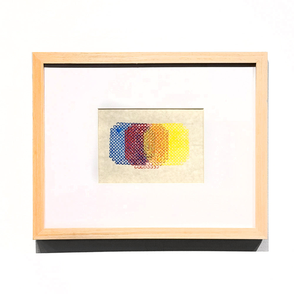 Spectrum Wheel by Terry Majewski is a colorful print made with overlapping circles. The circles shift from blue to red to yellow, blending together to create a soft rainbow effect. The tiny shapes are carefully arranged to make a pattern that feels both calm and full of energy.