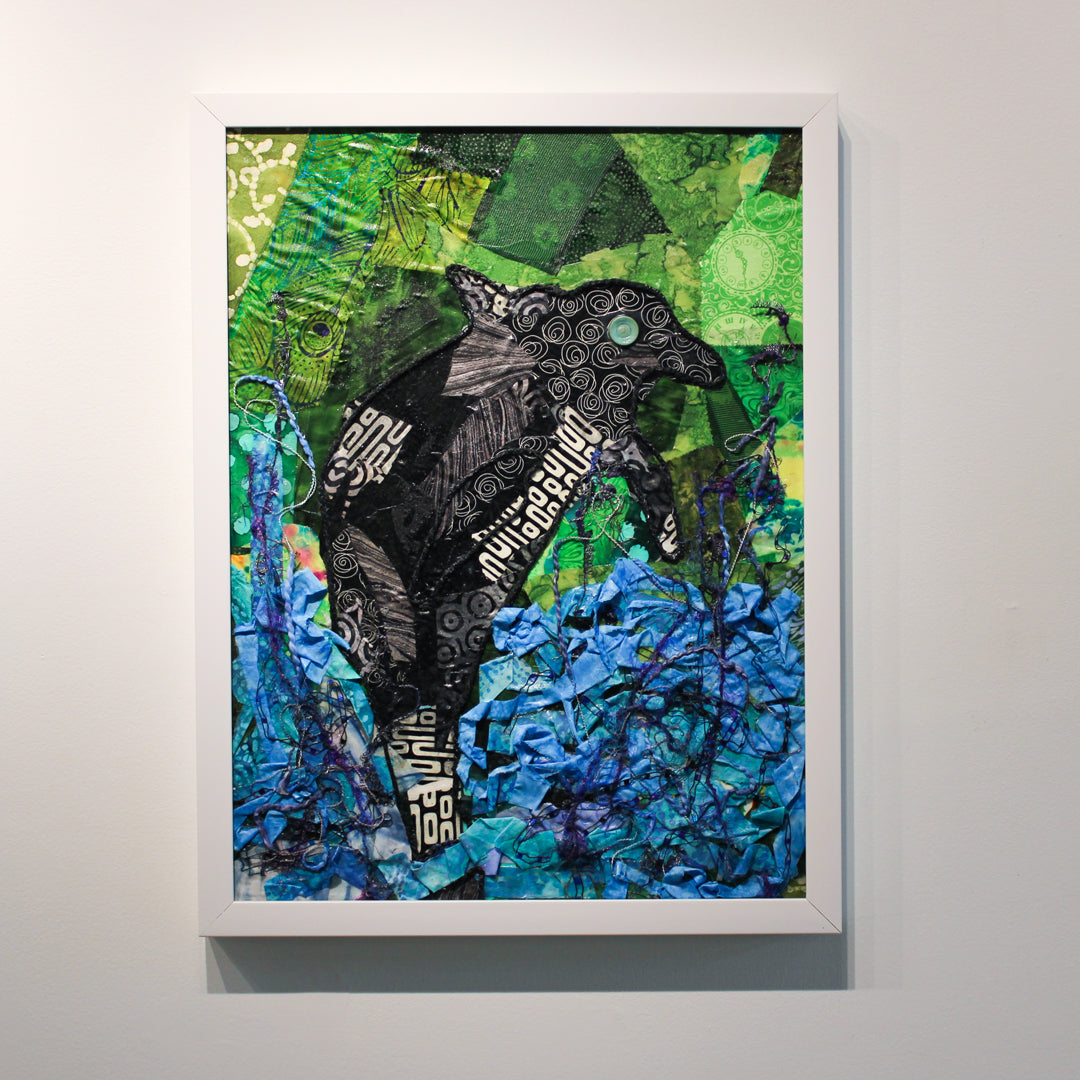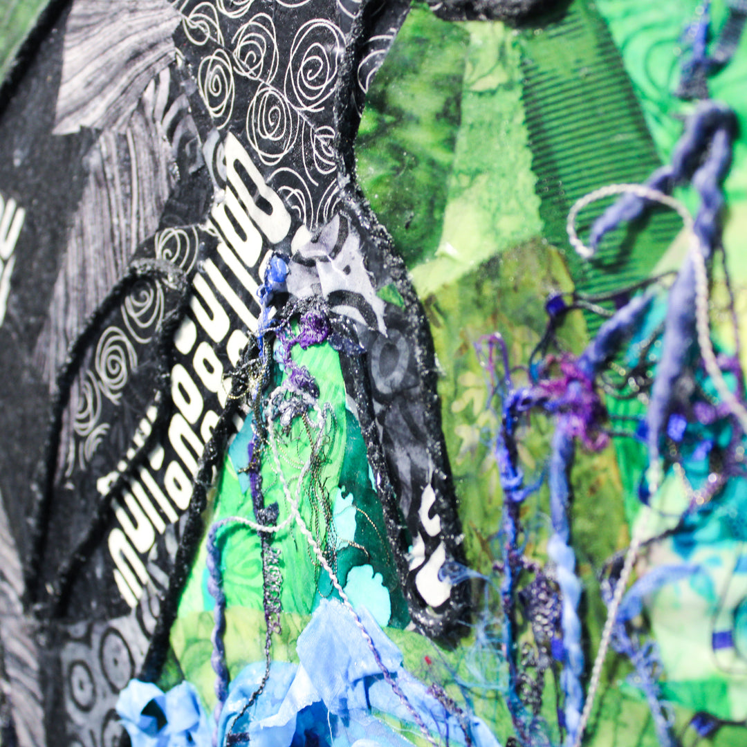 Nicky Tons’ Splash is a vibrant fiber art piece that captures the energy and fluidity of water through an intricate blend of textures, patterns, and colors. Layers of fabric, threads, and mixed media in shades of green, blue, and black are skillfully arranged to create a dynamic and immersive composition. The interplay of bold patterns and organic shapes evokes the motion of splashing water, while the tactile elements invite closer inspection. Perfect for those who appreciate innovative and textural artistry, Splash is a stunning celebration of nature’s movement and beauty, making it a captivating focal point for any space.