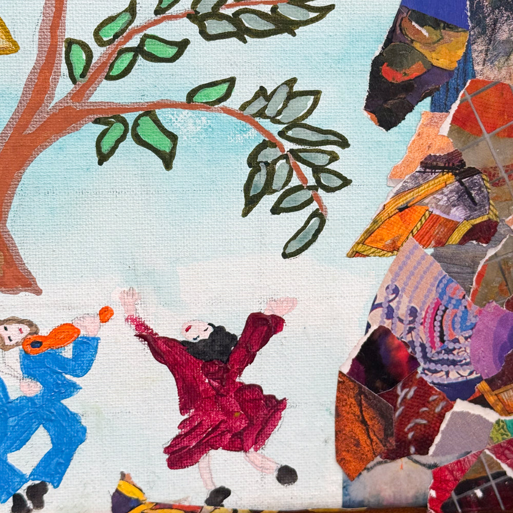 Gathered in Light by Carlie Suris shows a large tree with bright green leaves and a golden Star of David hanging at its center. Around the bottom of the tree, small dancing figures in colorful clothing move together, giving the artwork a happy, lively feeling. A border made of torn paper pieces surrounds the scene, adding texture and color. The whole piece feels joyful and full of celebration, like a moment of community brought to life.