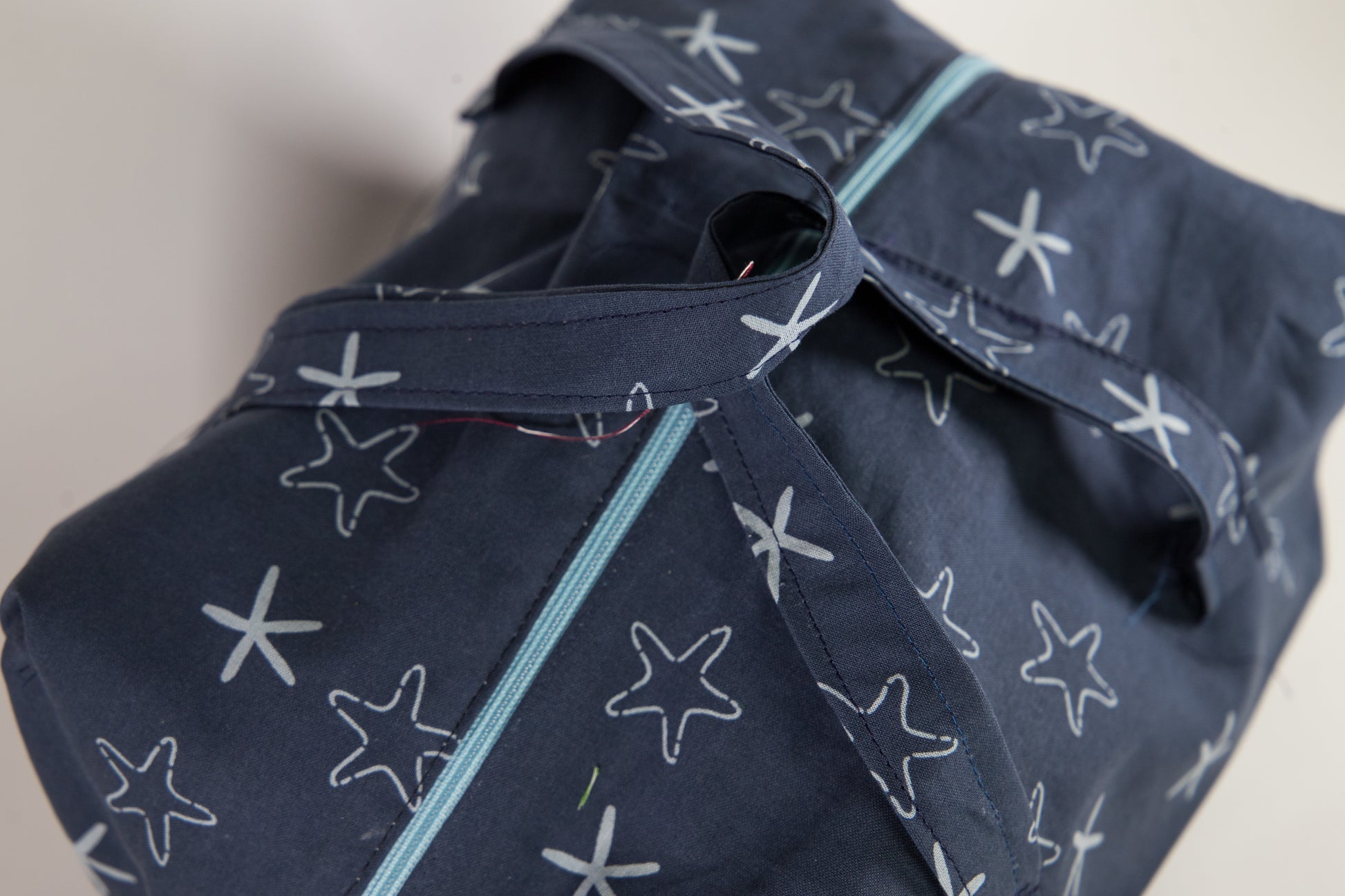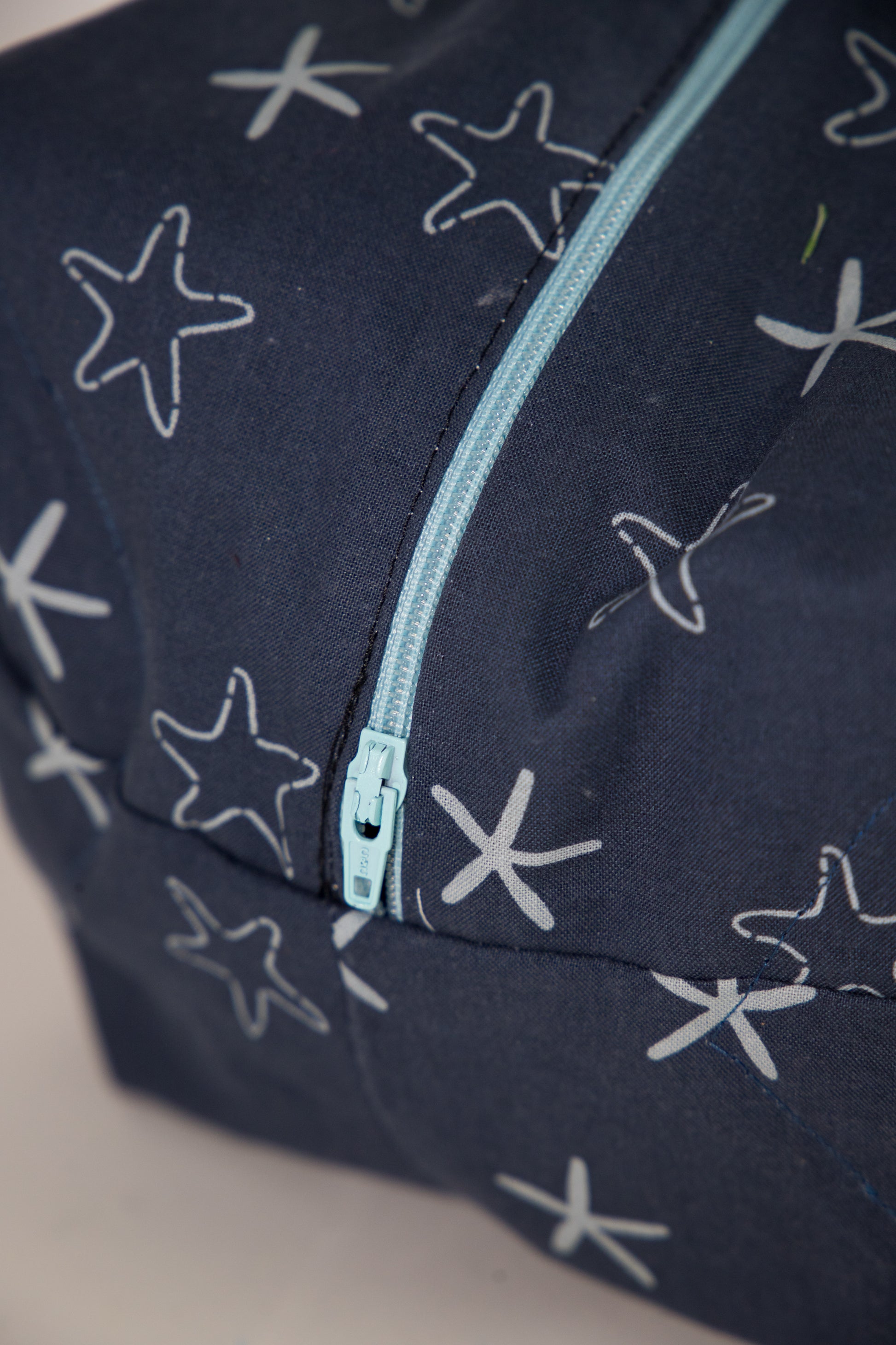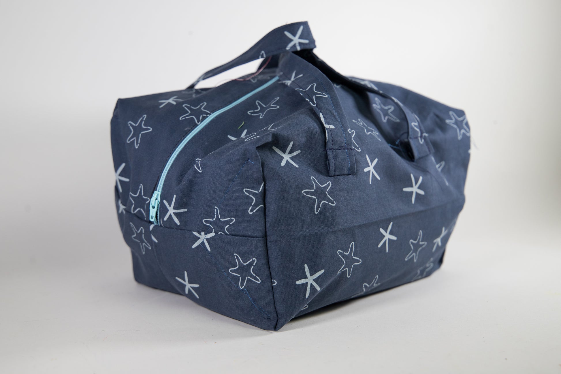 Embark on your next adventure in style with our charming toiletry bag, crafted from luxurious dark blue fabric adorned with delicate pale light blue starfish patterning, reminiscent of tranquil seaside vistas. Designed with practicality in mind, this tote features two short handles for easy carrying and a secure zipper closure to keep your essentials organized and accessible. Meticulously sewn by Theodore Bednark, each bag embodies a commitment to quality craftsmanship and timeless elegance. Whether jet-setting to exotic destinations or simply organizing your daily essentials, indulge in the perfect blend of functionality and coastal-inspired flair with our starfish-patterned toiletry bag.