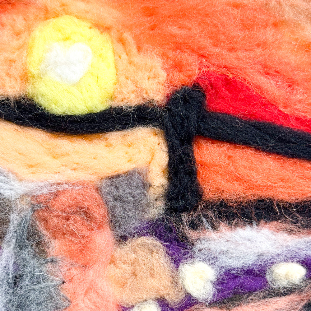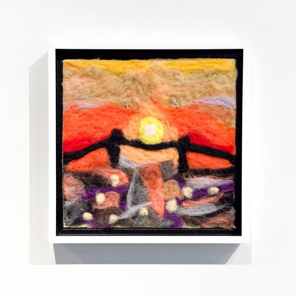 The Bridge by Joseph Shammami is a warm and glowing needle-felted artwork that shows a bridge at sunset. The bright orange and yellow sky surrounds a glowing sun, while soft shapes below look like buildings and lights. The black bridge stands tall in the center, bringing everything together. This piece feels peaceful and strong, like a quiet evening in the city.