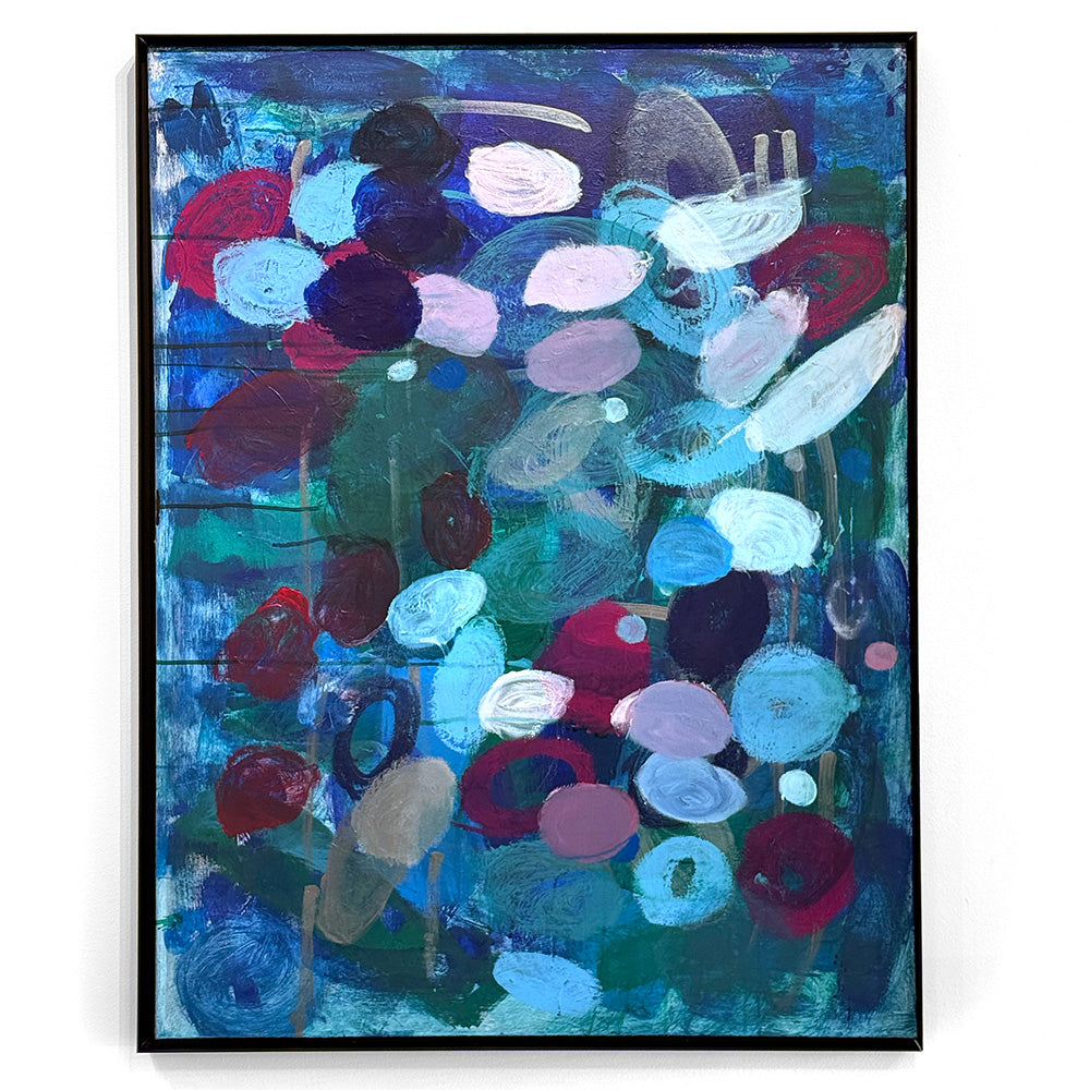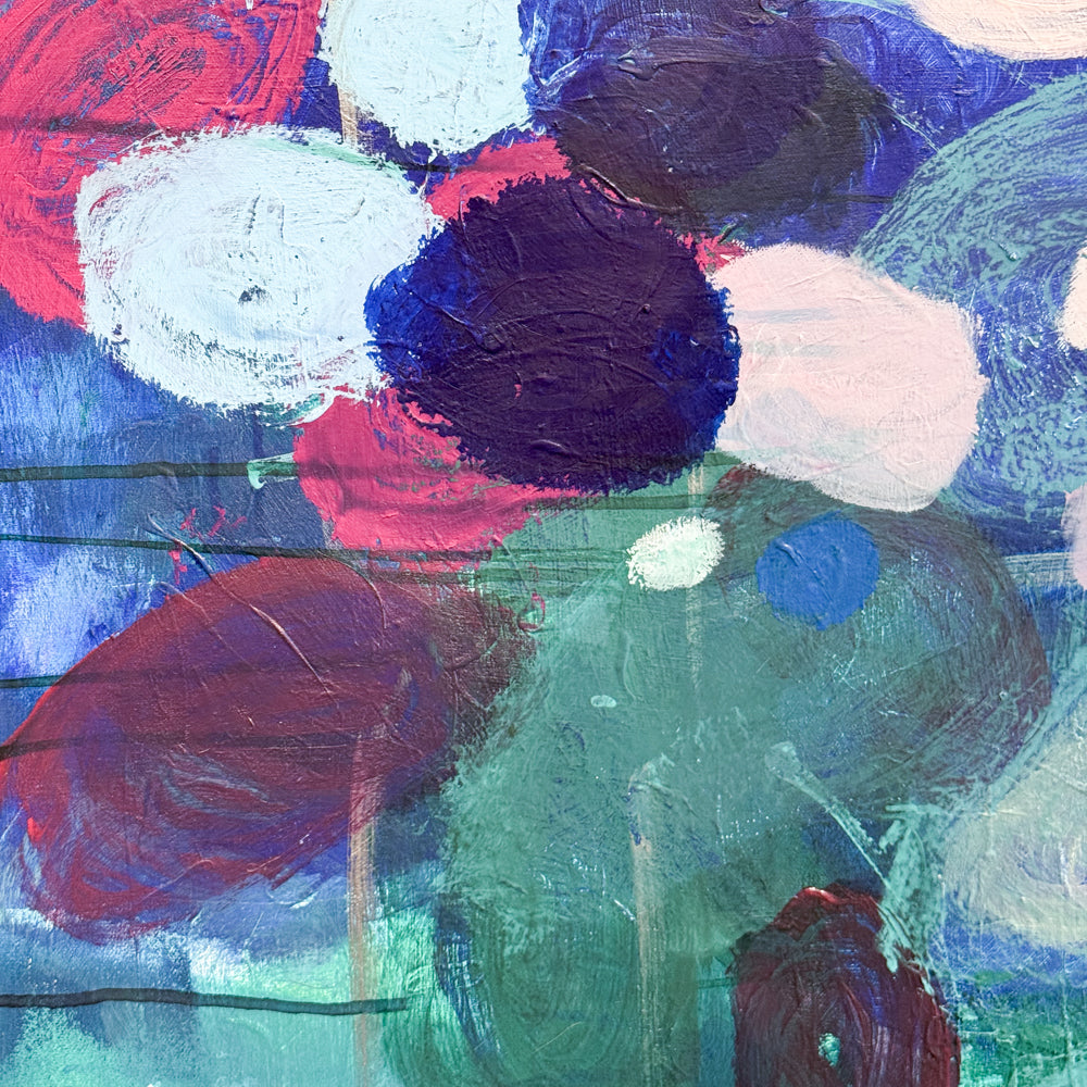 The Cosmos by Aislinn Wendrow is a colorful acrylic painting filled with round, floating shapes in blues, purples, reds, and whites. The shapes look like stars or planets drifting through space. The deep background colors and swirling brushstrokes make the scene feel dreamy and far away. Aislinn’s painting invites us to imagine the beauty and mystery of the universe.