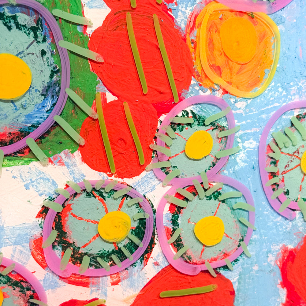The Eye by Megan Donley is a bold and colorful painting made with acrylic paint and resin. Bright red, green, orange, and yellow shapes cover the canvas, surrounding a large green eye that peeks out from the top right corner. The piece feels playful and full of energy, like it's watching a lively world through a sea of color.