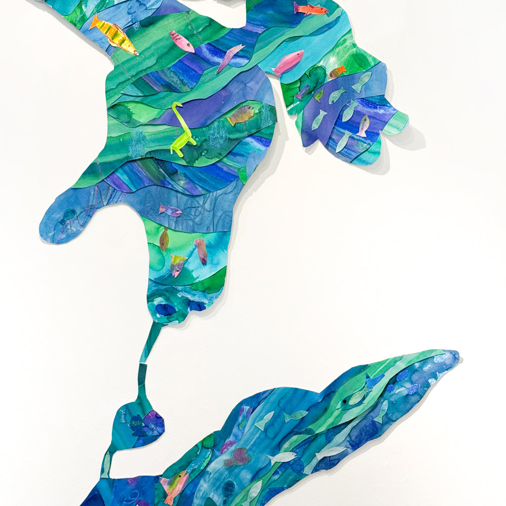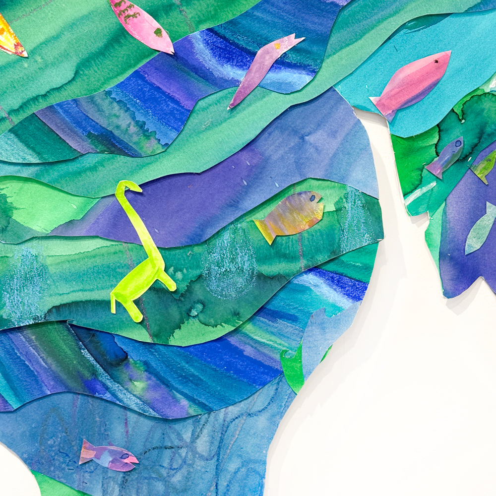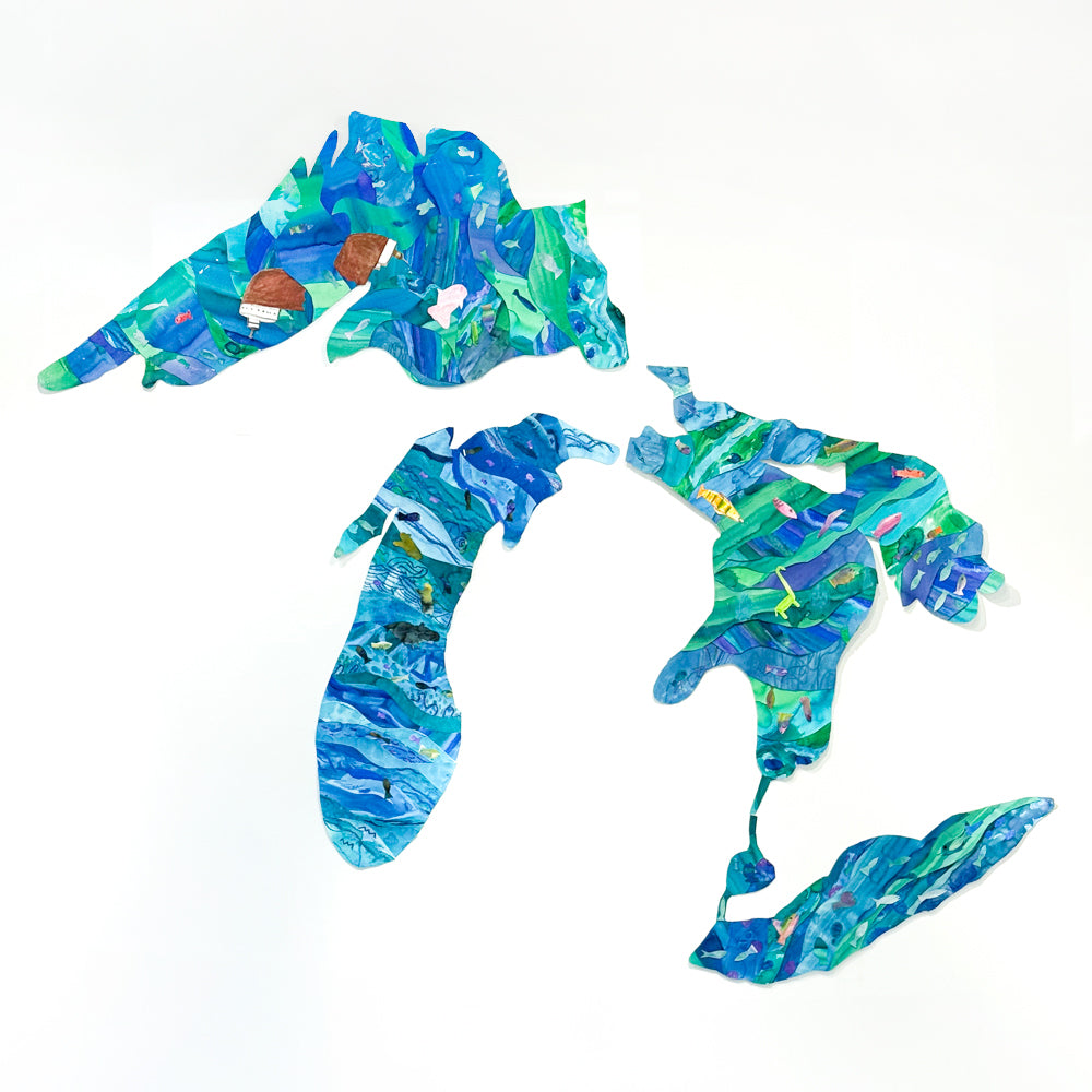 The Great Lakes is a beautiful collage made with help from Facilitating Artist Leslie, who worked with others to hand paint paper and build each lake. Each Great Lake is filled with colors, shapes, and textures that show what makes it special—like boats, fish, lighthouses, and waves. This artwork is a fun and creative way to celebrate the beauty and importance of the lakes that make Michigan so unique.