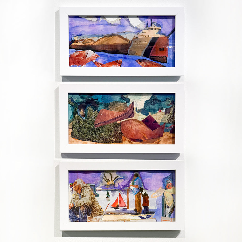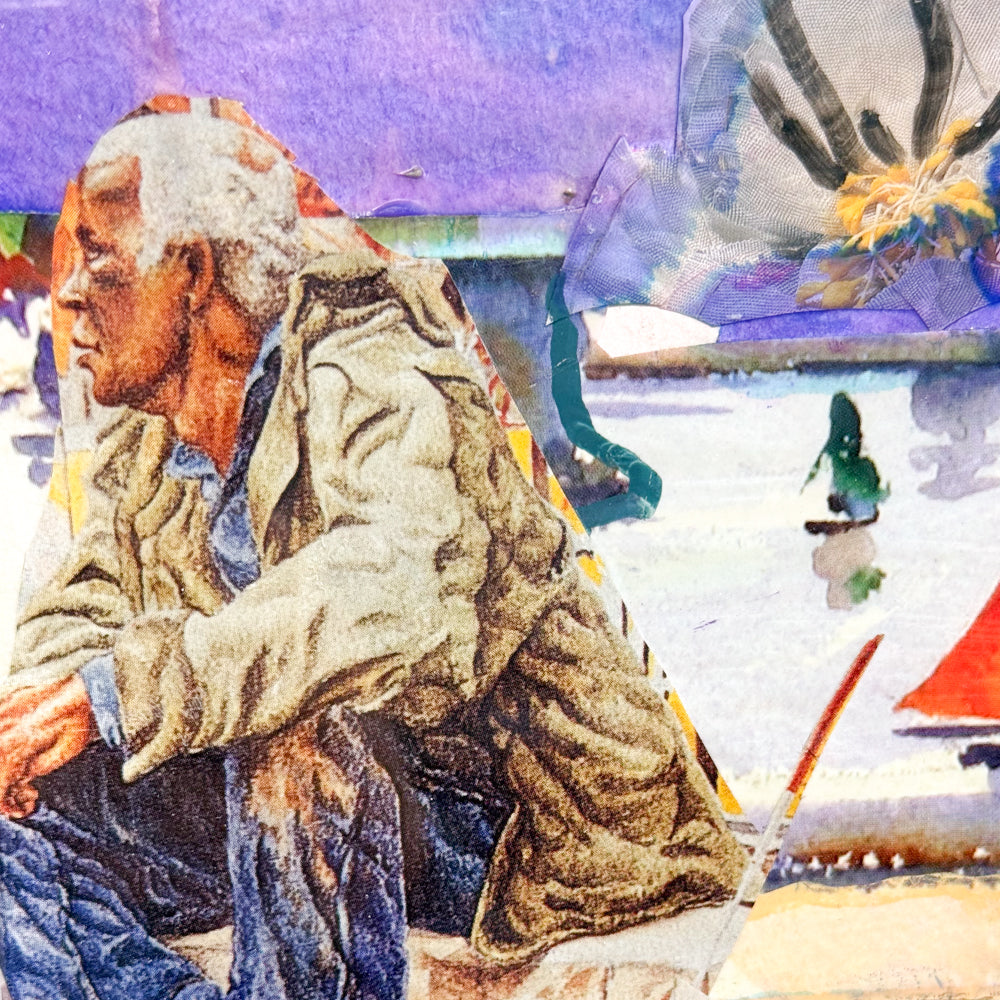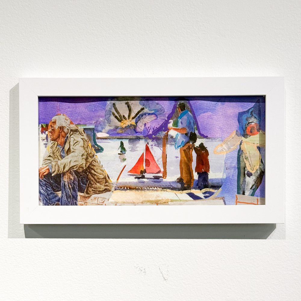 The Man at the Waterfront by Jennifer Kuhn-Freed is a colorful collage made from many pieces of paper that tell a story about life by the water. In each part, you can see boats, people, and nature all around. The bottom scene shows a man sitting and looking out at the lake, as sailboats glide by. The bright colors and detailed textures make the artwork feel alive, like a peaceful day spent by the shore.