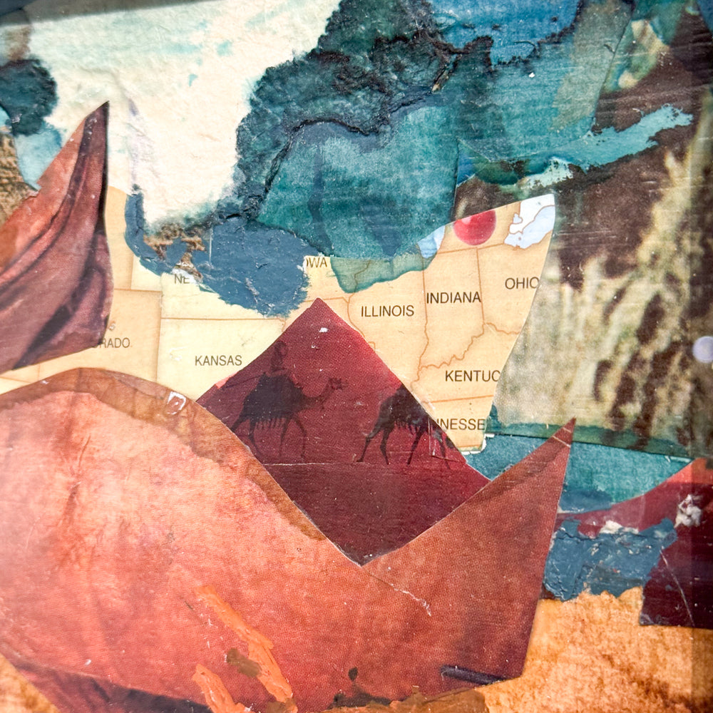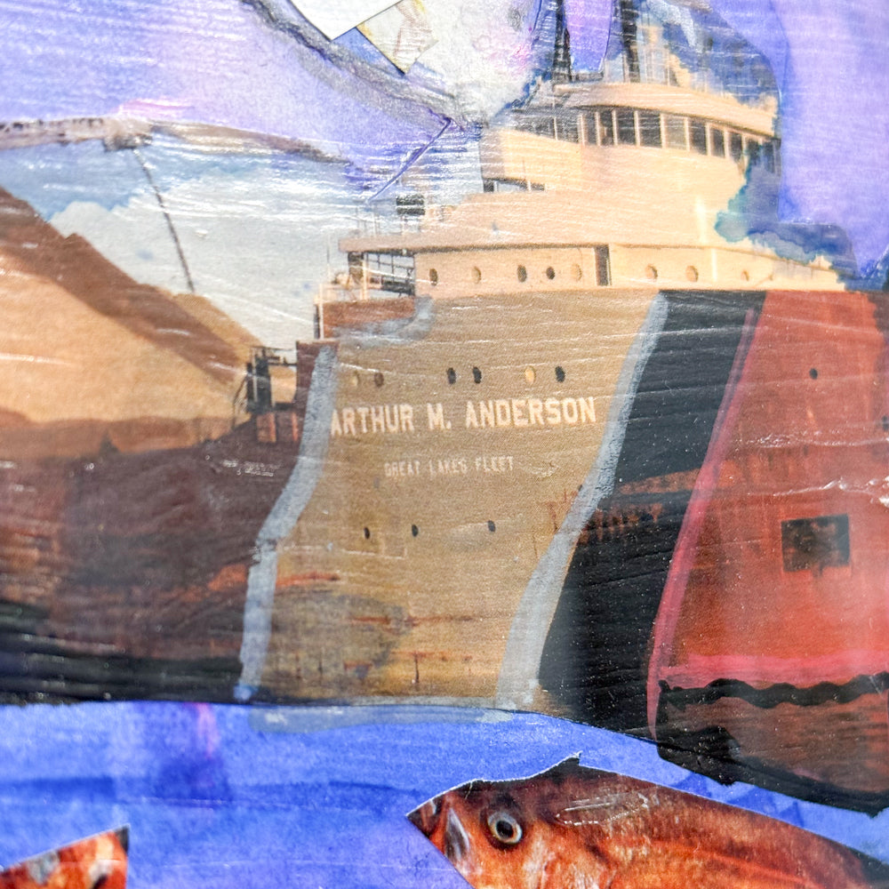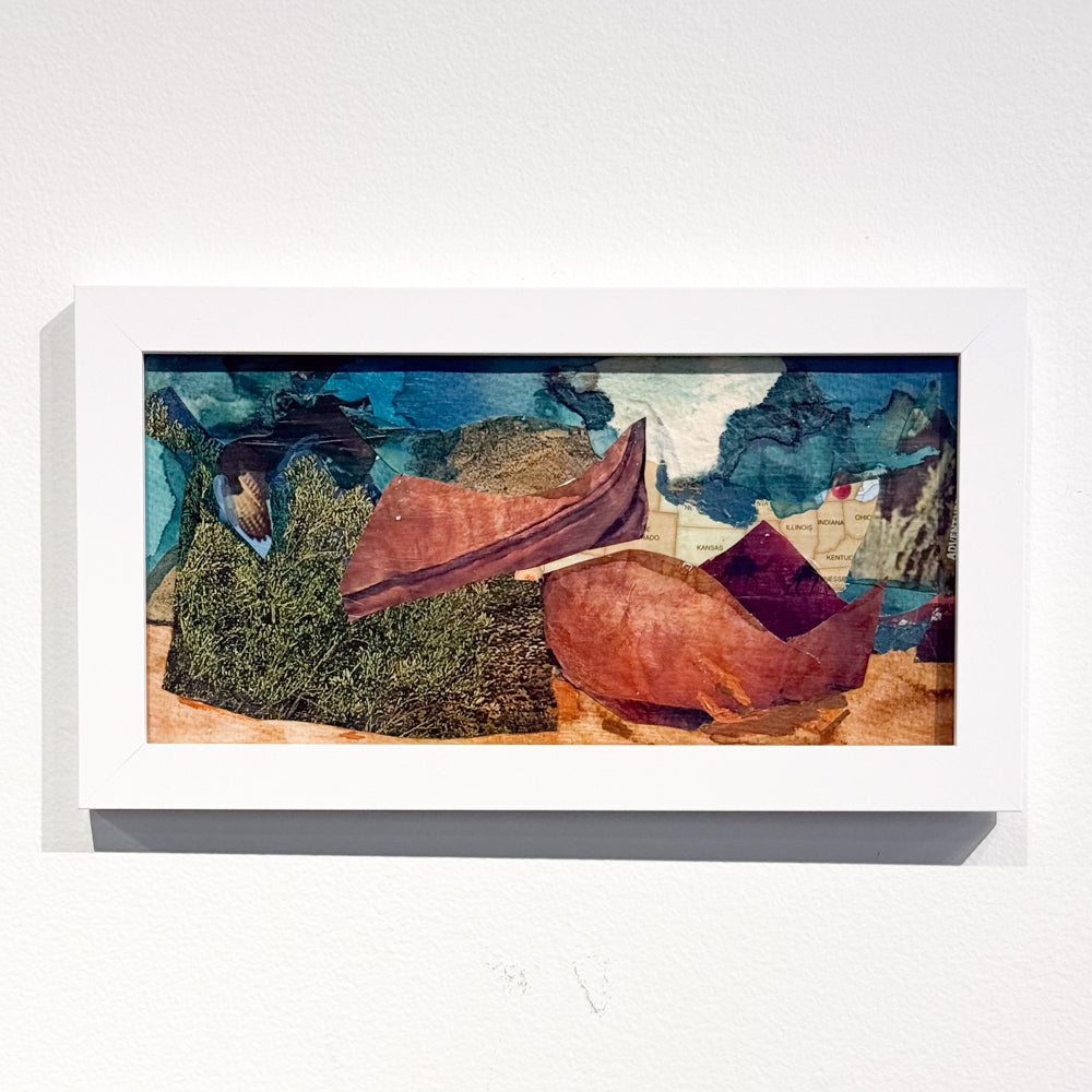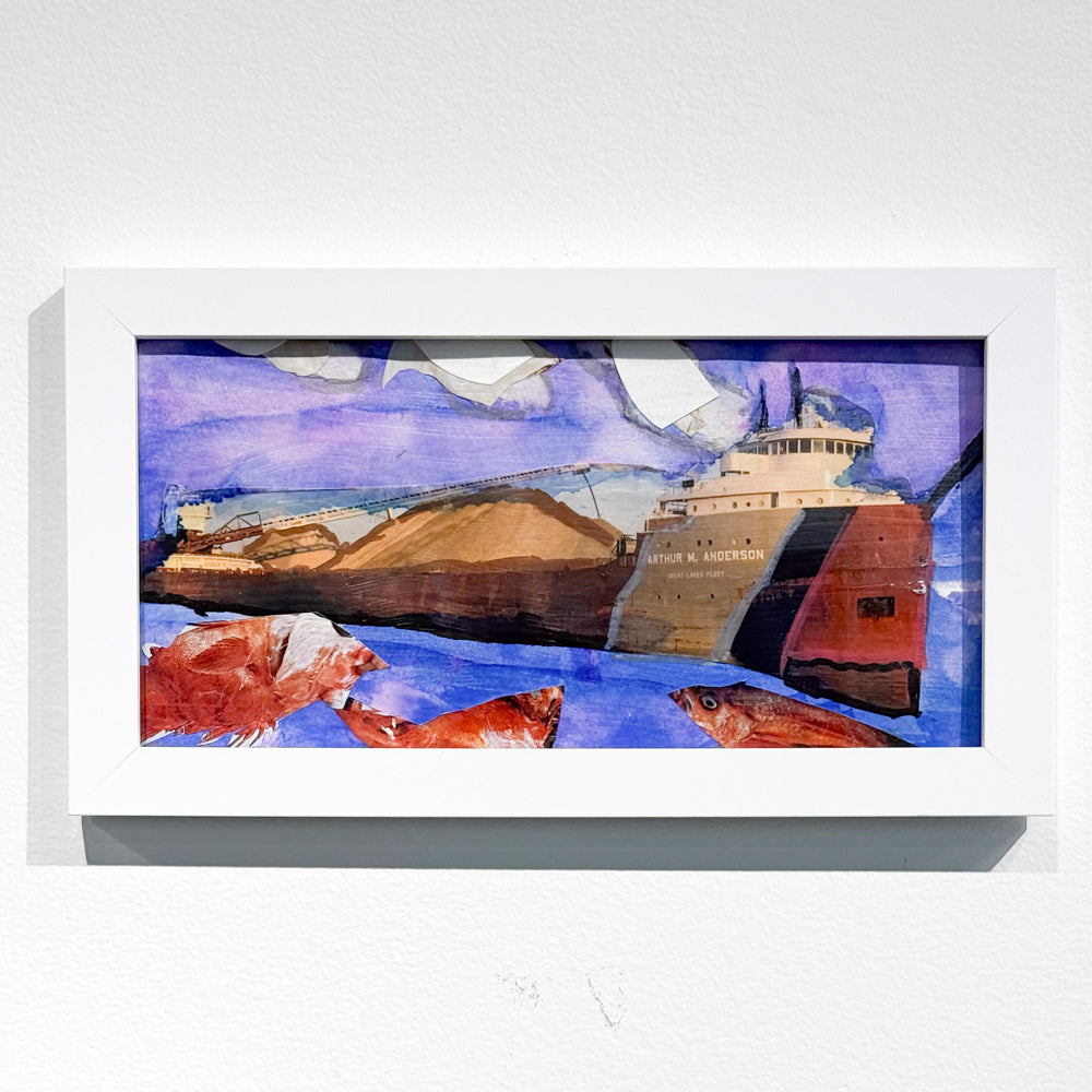 The Man at the Waterfront by Jennifer Kuhn-Freed is a colorful collage made from many pieces of paper that tell a story about life by the water. In each part, you can see boats, people, and nature all around. The bottom scene shows a man sitting and looking out at the lake, as sailboats glide by. The bright colors and detailed textures make the artwork feel alive, like a peaceful day spent by the shore.