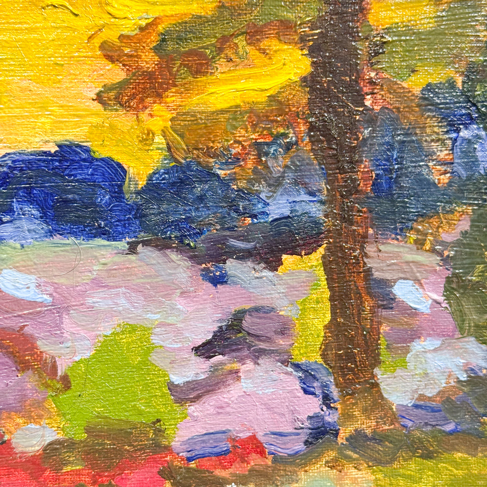 The Pines by Nicky Tons is a bright and colorful painting of tall pine trees. The sky is glowing with shades of yellow, purple, and orange, while the ground is full of soft colors like pink, blue, and green. The bold brushstrokes make the trees and landscape feel full of movement and light. It’s a peaceful and beautiful look at nature at the end of the day.