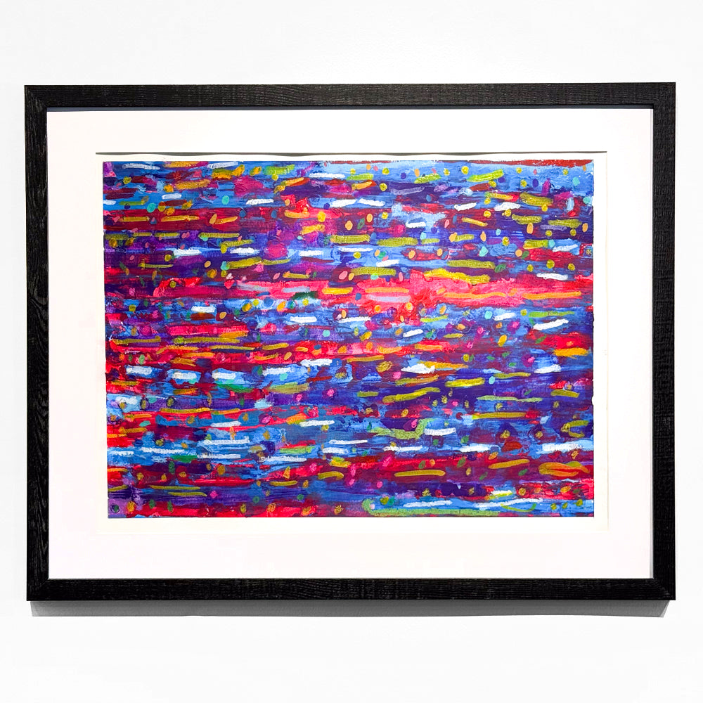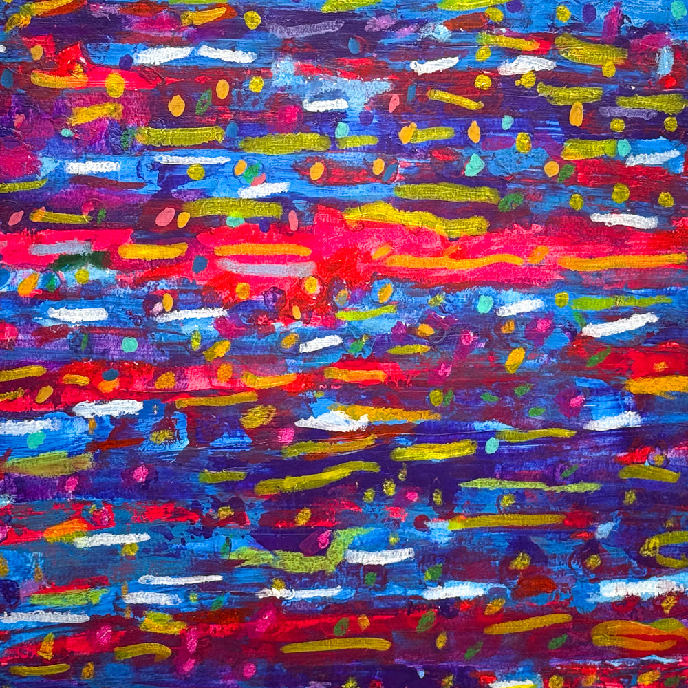 The Spark of Lightning by Caryn Martel is a bold and colorful painting filled with energy. Short, bright brushstrokes in red, yellow, blue, and white streak across the canvas like flashes of light. Dots of color add a playful feel, as if sparks are flying through the sky. The painting feels alive and full of movement, just like a lightning storm.
