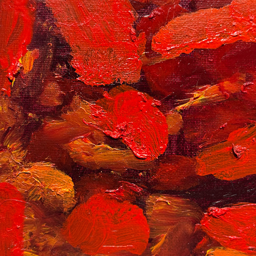 There Will Be Blood by Shira Schweitzer is a bold and expressive acrylic painting filled with thick, textured brushstrokes in rich reds, deep oranges, and earthy tones. The layers of color swirl together in a fiery and dramatic way, creating a powerful feeling of movement and emotion. This piece draws you in with its intensity and striking color palette.