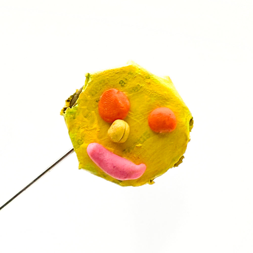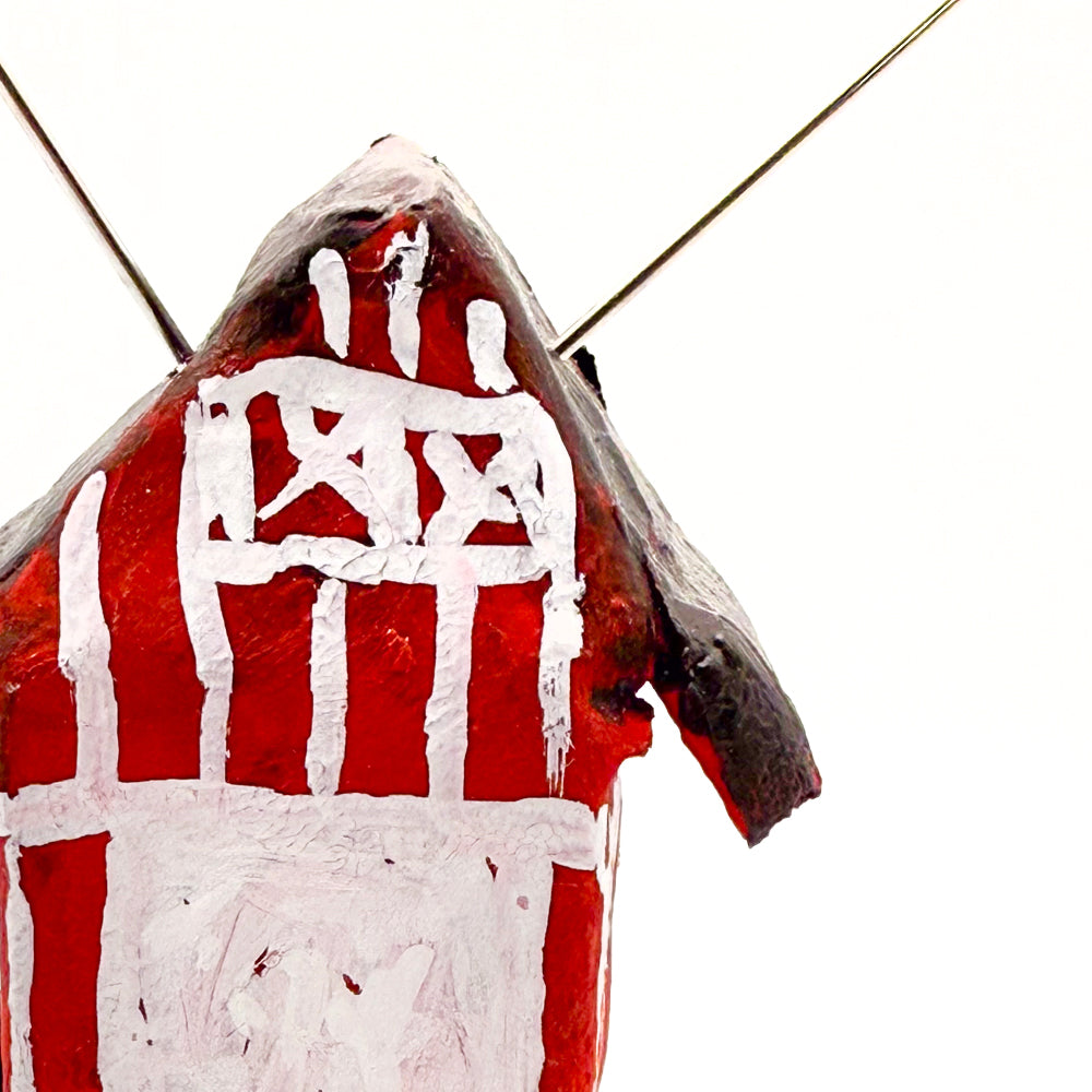 Tiny Barn by Alyssa Gold is a small painted sculpture of a red barn with white trim, perched on a wooden base. A smiling yellow sun and a crescent moon float above on thin wires, adding a cheerful, whimsical feel. A tiny black animal and orange ball rest beside the barn door, bringing this charming, storybook scene to life.