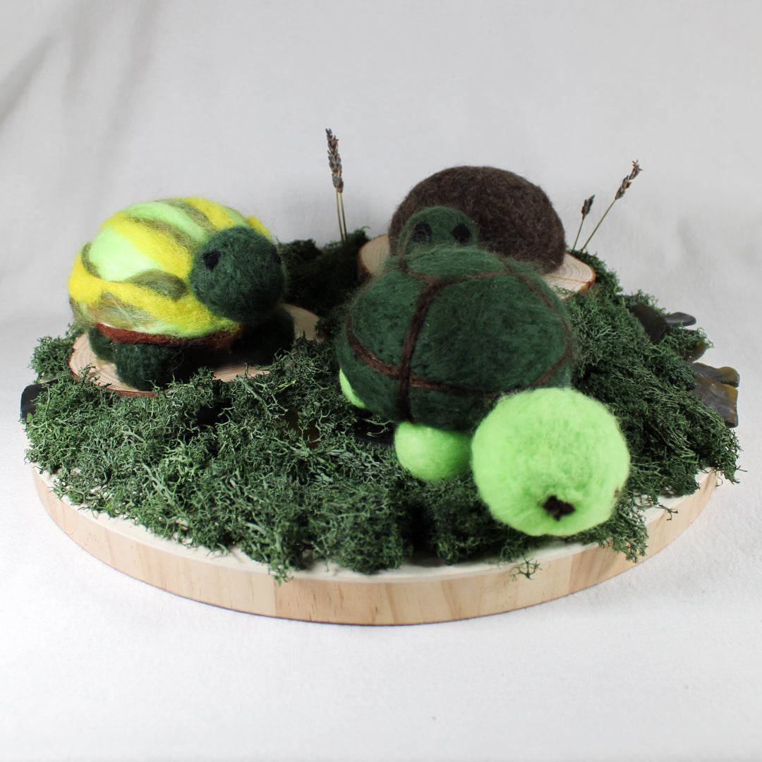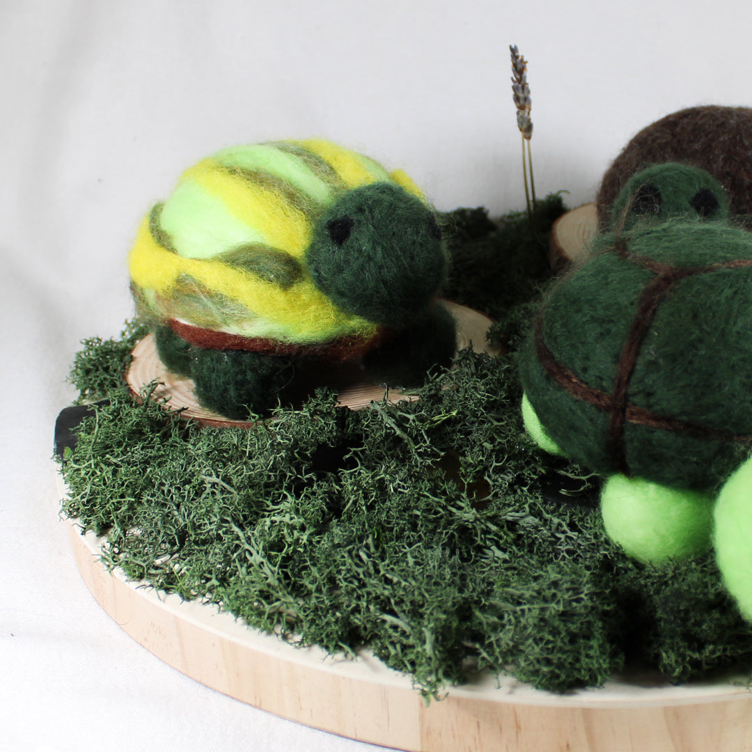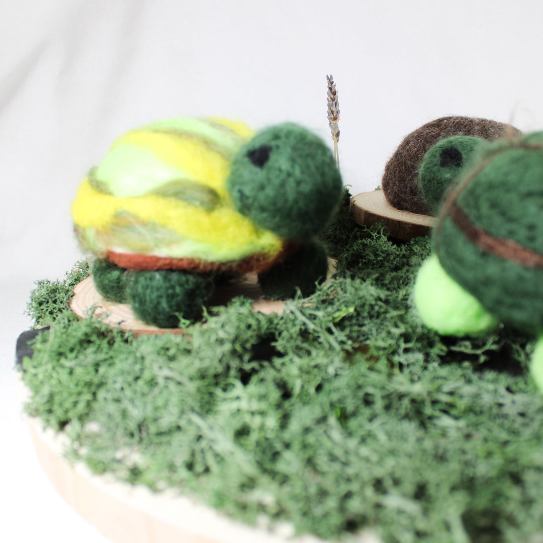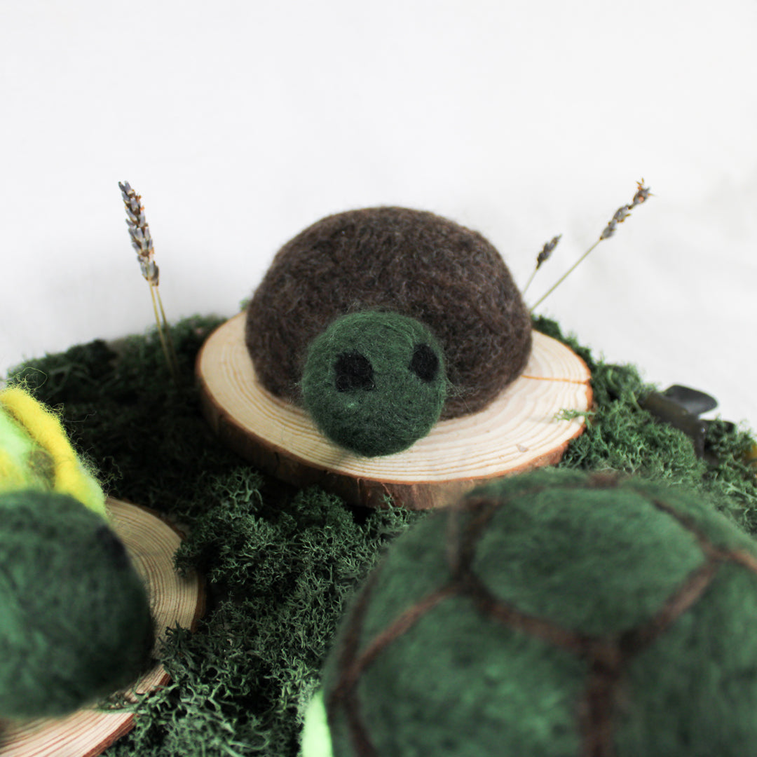 Turtle Family is a charming wool-felted artwork that brings a delightful woodland scene to life. Featuring a group of intricately crafted turtles with vibrant, hand-dyed wool shells in earthy tones of green, yellow, and brown, this piece radiates warmth and creativity. Each turtle rests on a natural wood base, surrounded by a lush bed of moss, adding a whimsical and organic touch to the composition. Perfect for nature enthusiasts or as a unique decorative accent, Turtle Family celebrates the beauty of handcrafted art while evoking the serenity of a tranquil forest habitat.