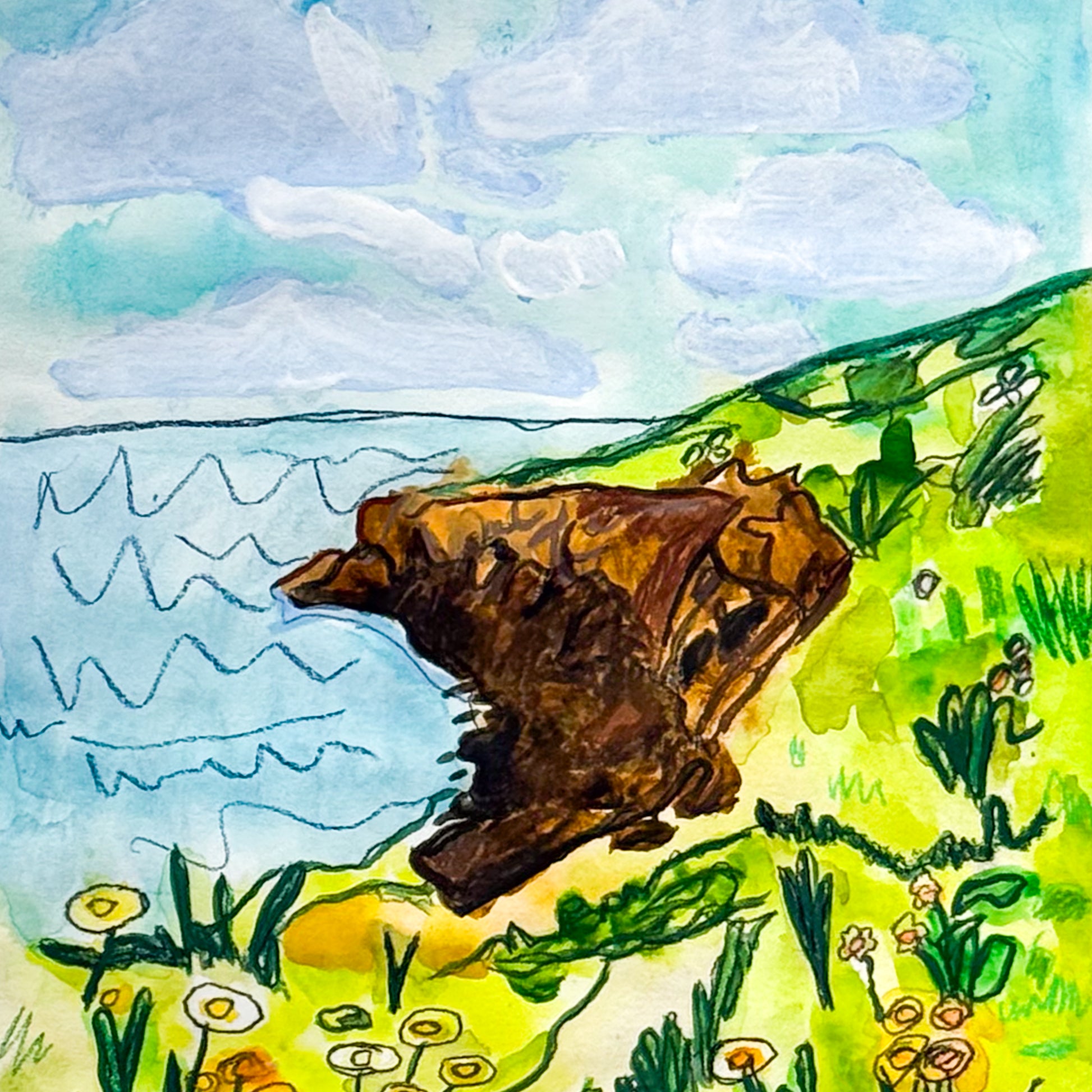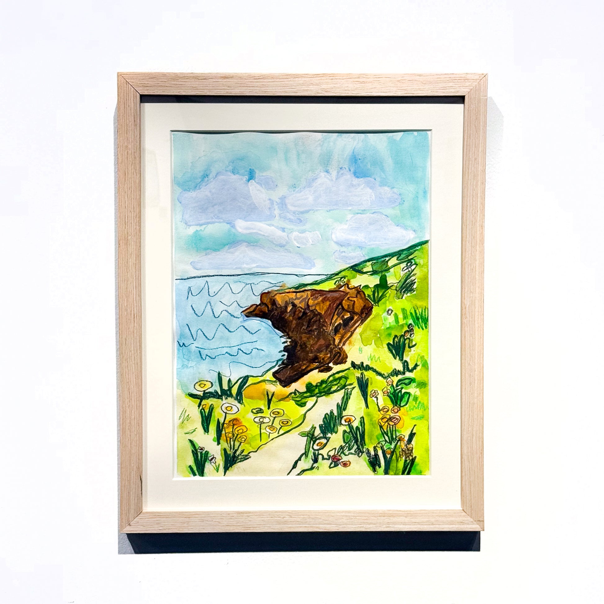Waterfront by Nicky Tons is a mixed media artwork showing a rocky cliff beside the water. A large brown rock sits on the grassy hill, looking out over the blue waves below. Bright green grass and small yellow and white flowers grow along the path, adding color to the shoreline. Soft clouds float across the sky, giving the peaceful coastal scene a calm and breezy feeling.