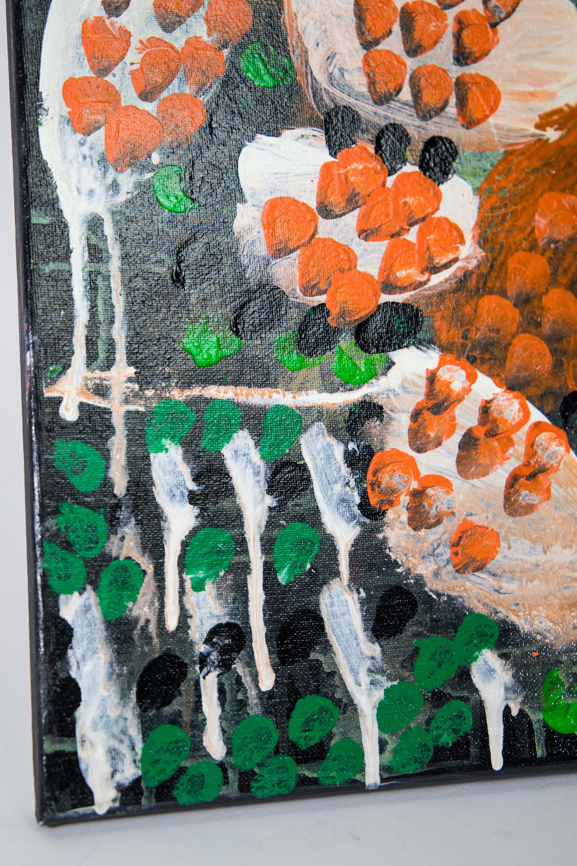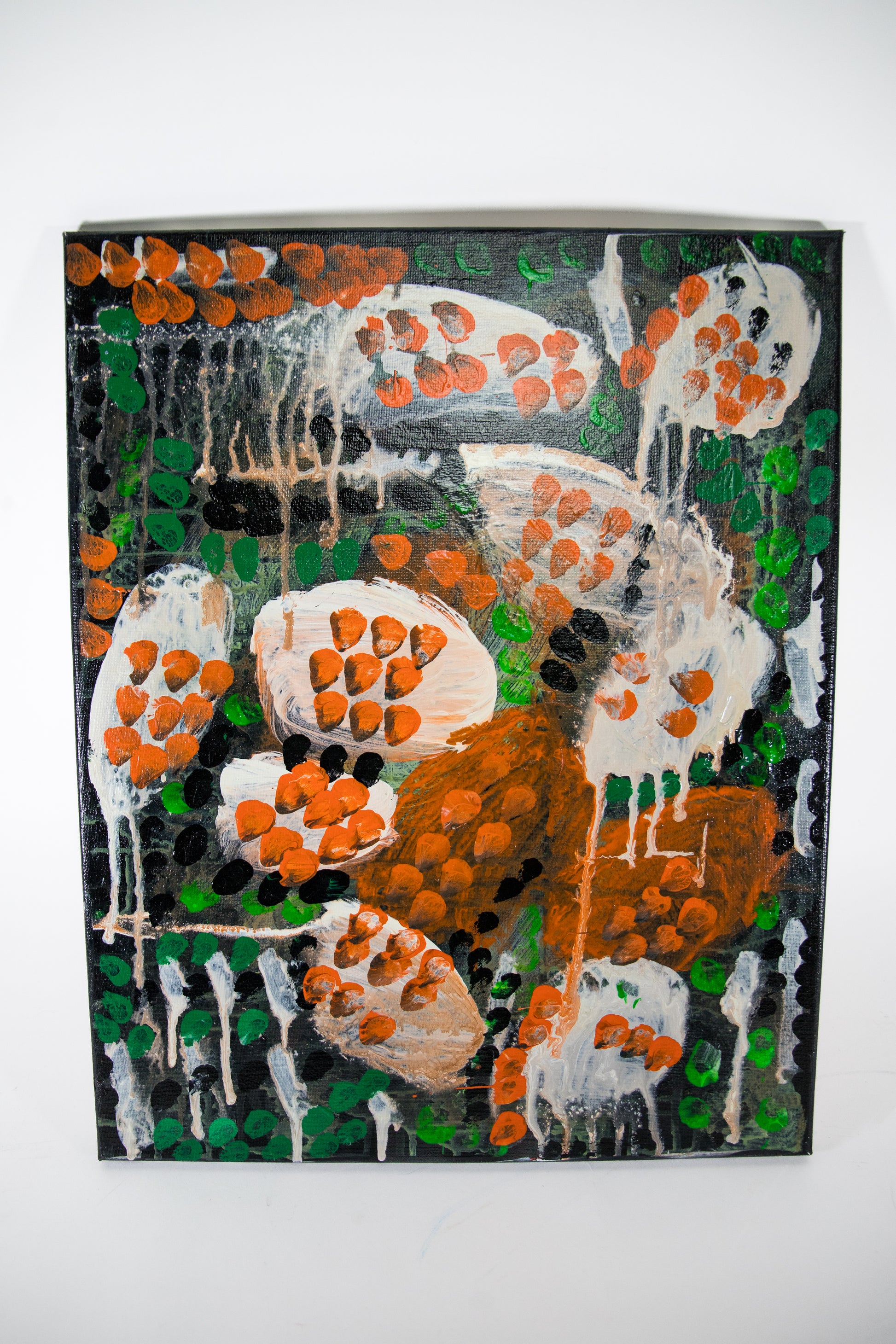 Composed of dripping splashes of greens, oranges, whites, and blacks, Aislinn is inviting her viewer into a world where green and orange meet.
