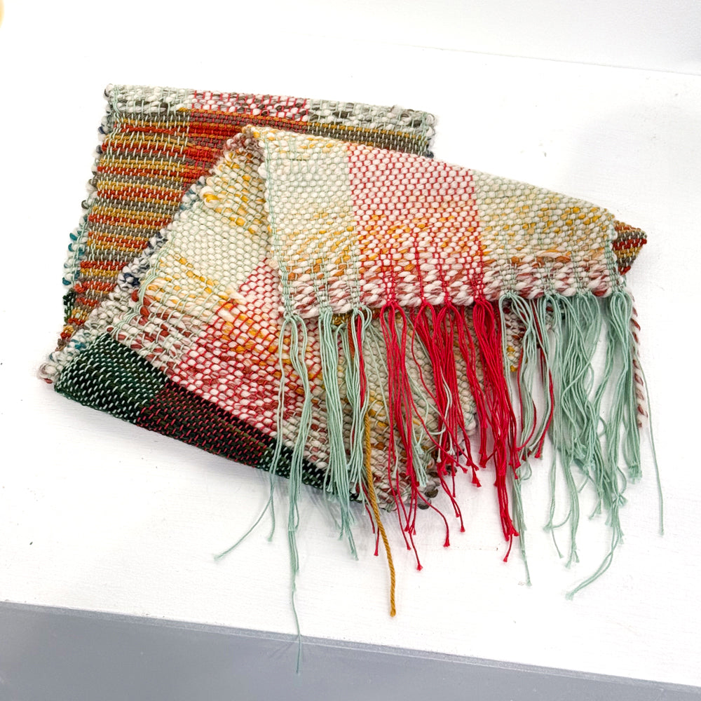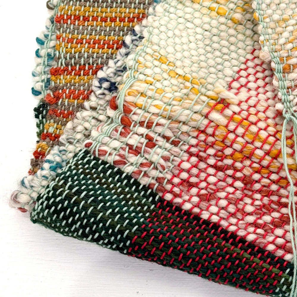 Early Fall in Michigan by Stacey Salzberg is a bright, handwoven piece full of warm colors. Red, yellow, white, and blue yarns mix together in a lively, textured pattern. Soft fringe in pale blue and red adds a playful finish, bringing even more energy and movement to the piece.