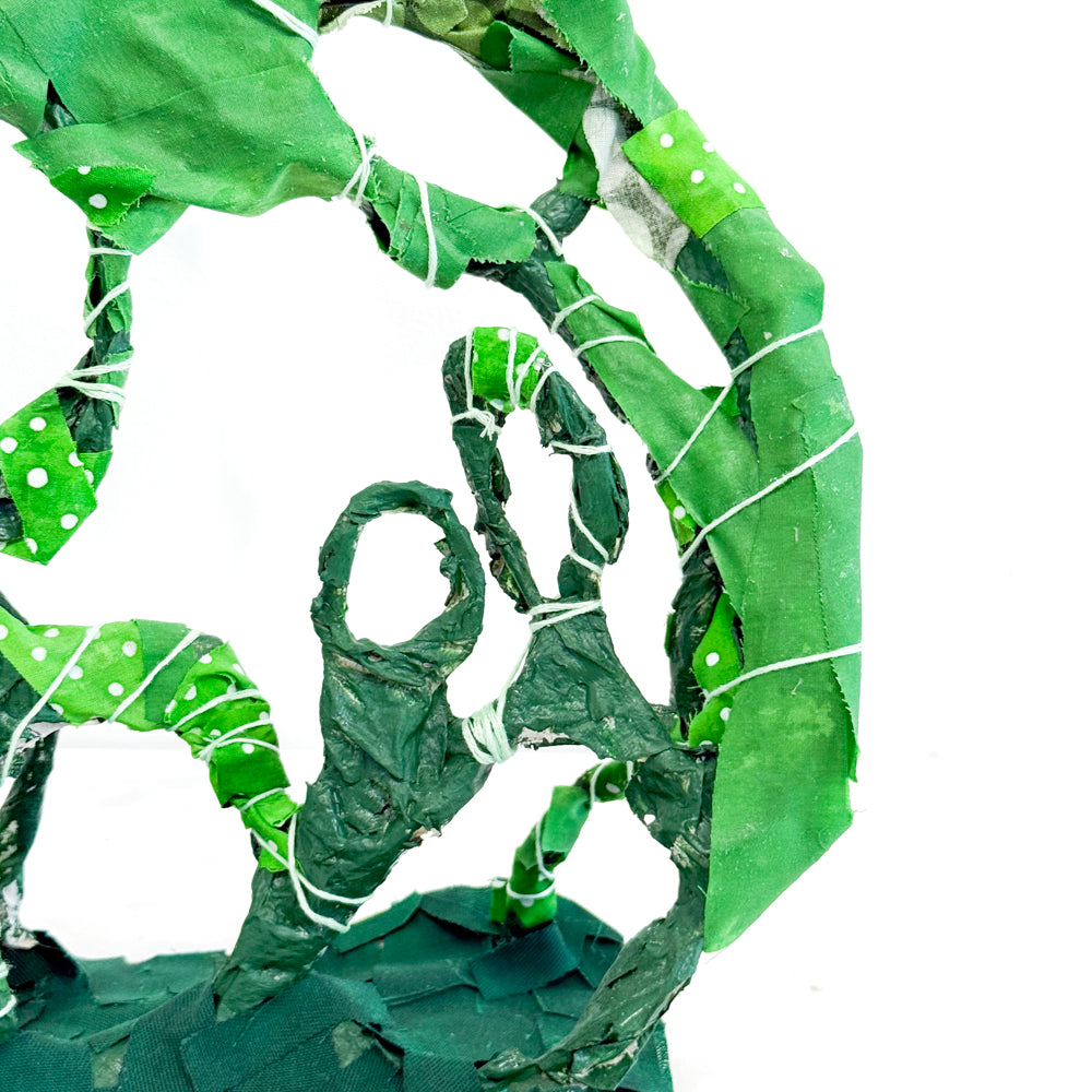 Winding Garden Path by Nathan Colombo is a sculpture made with wire, paper, and fabric. White string wraps around the branches, making it look like a plant or tree growing upward. It has twisting shapes that look like leaves or vines reaching for the sky. The piece feels both strong and gentle, like a peaceful walk through nature.