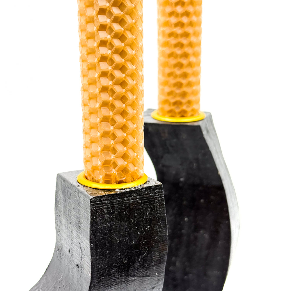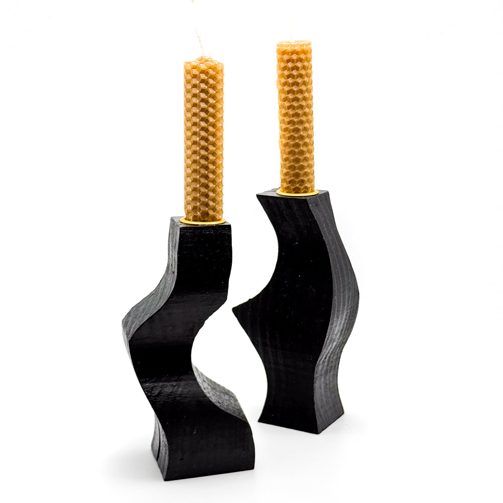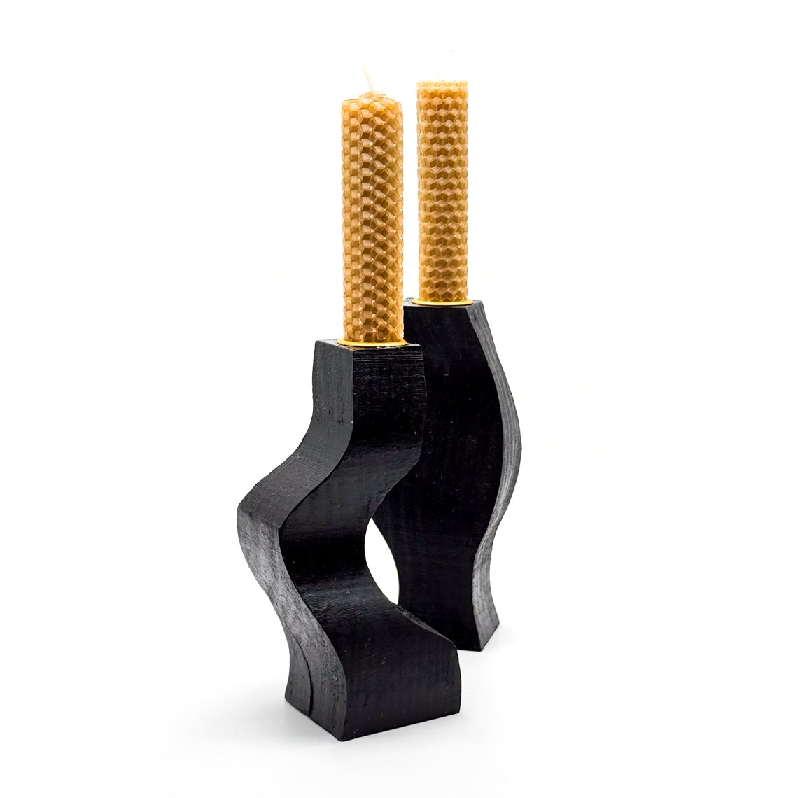These wooden candle holders by Devorah Newman are sold individually. Each holder is hand-carved with a smooth, curved shape and finished in black for a modern look. The photos show two holders to display how they pair together, but the purchase price includes one single candle holder.