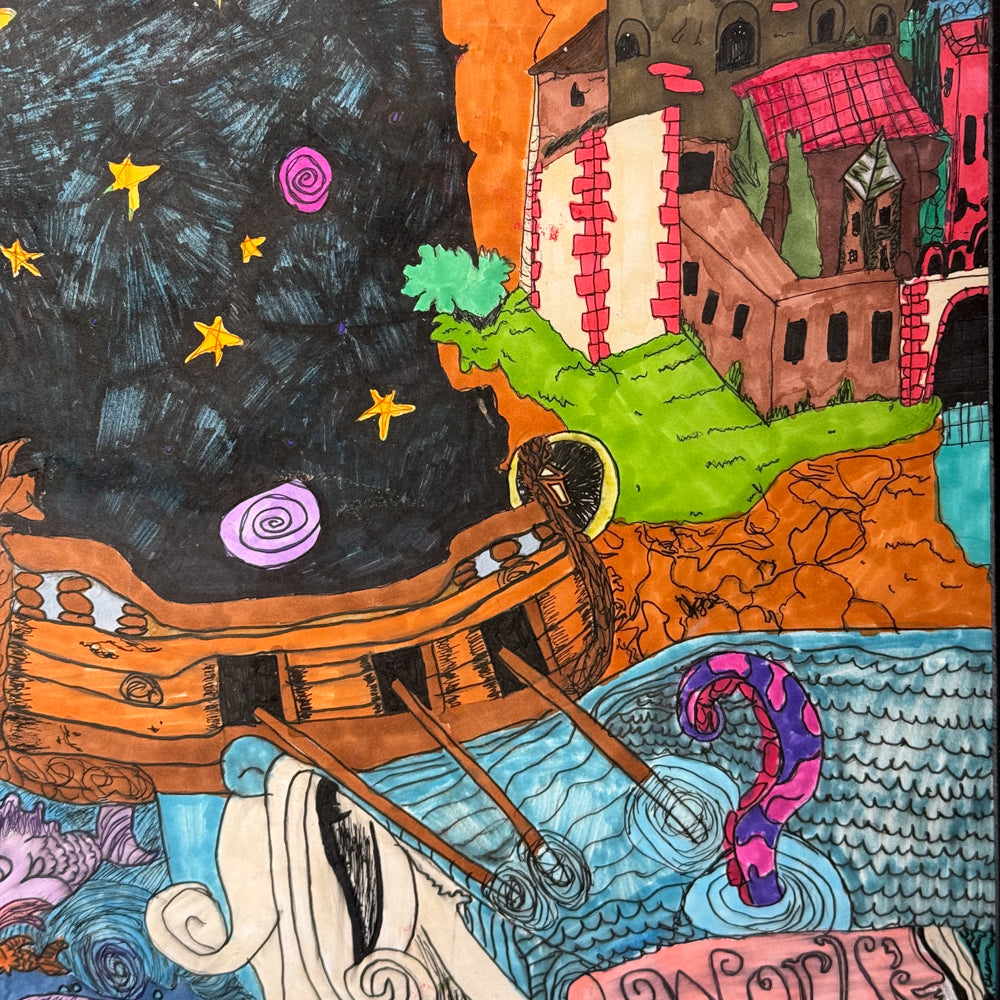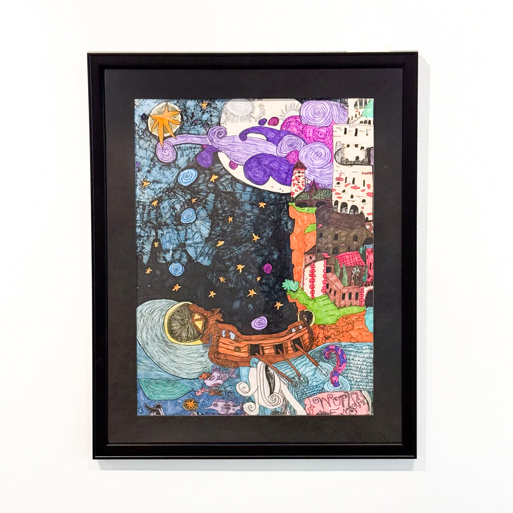 World’s Edge by Mikayla Woodiwiss shows a magical place where land, sea, and sky all come together. Swirling clouds, stars, and water move around buildings and bridges, making the scene feel like a dream or a storybook world. The many details and bright colors invite you to explore the picture and imagine what might exist at the edge of the world.