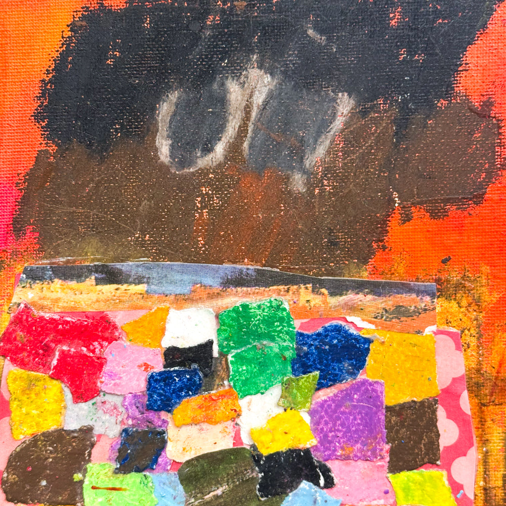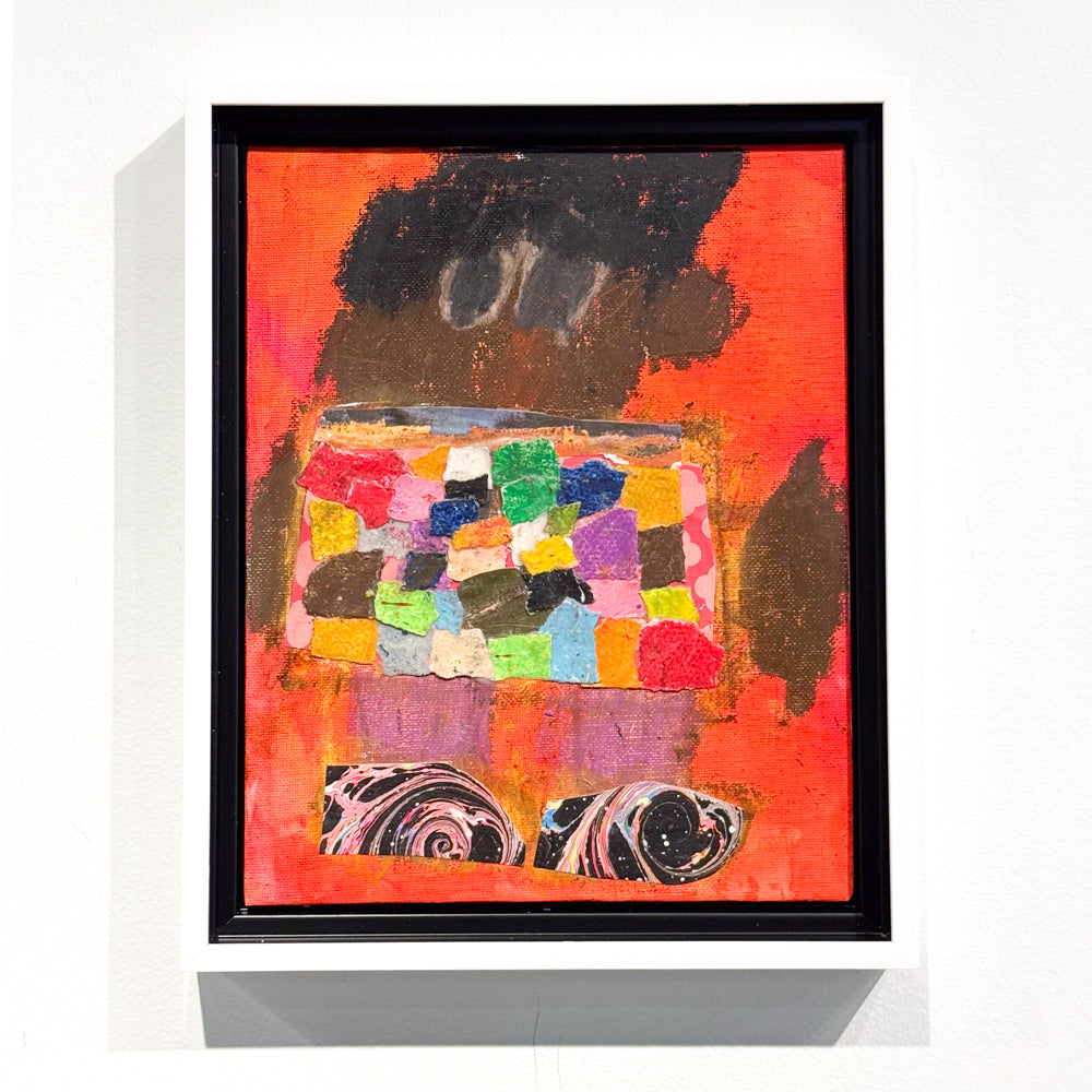 Yellow Shirt by Jonathan Barnett is a bold and colorful artwork that shows a person wearing a shirt made of bright, torn paper pieces. The shirt is full of rainbow colors like red, green, blue, and purple, standing out against a glowing orange background. The pants have fun swirly patterns, adding extra energy to the piece. It’s a playful and creative portrait that feels full of joy and personality.